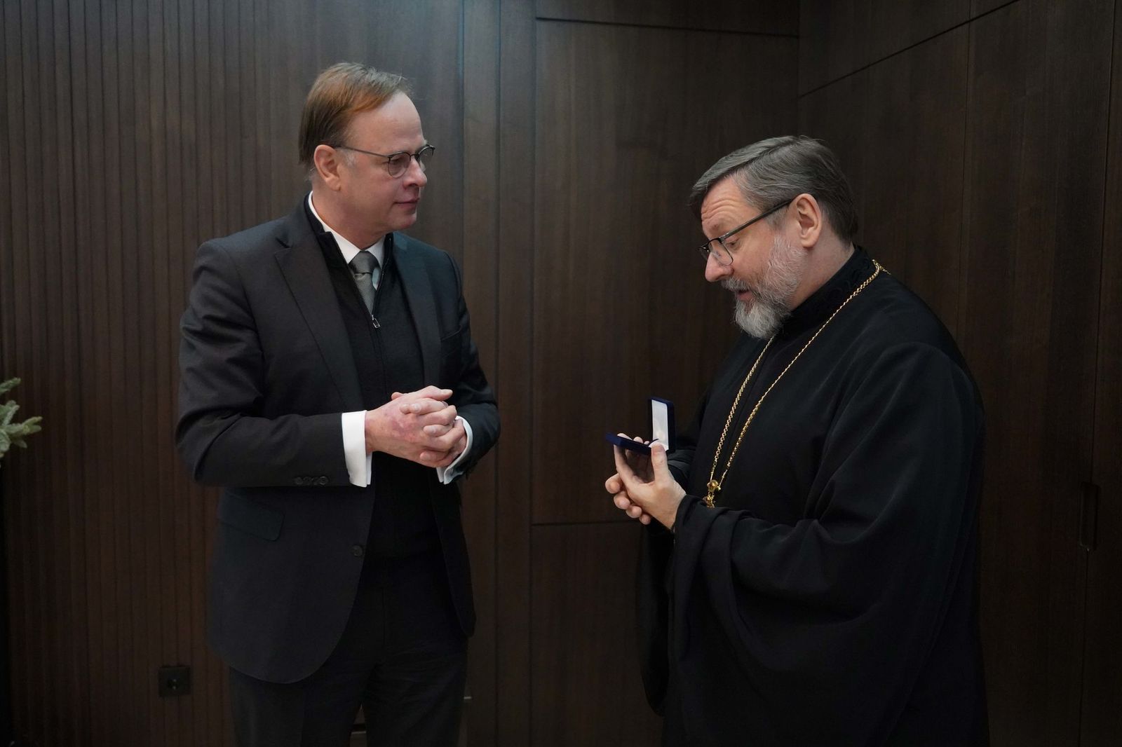 Основну частину розмови Глава УГКЦ та пан Посол присвятили ролі релігії в українському суспільстві, зокрема під час війни. Блаженніший Святослав розповів про історичну місію УГКЦ як Церкви простих людей, яка завжди була голосом народу, сприяла формуванню національної свідомості та протистояла імперським впливам Росії. Предстоятель підкреслив, що за роки війни частка греко-католиків в Україні зросла, а також розповів про глобальну мережу структур УГКЦ, її дипломатичні зусилля, масштабне соціальне служіння через «Карітас Україна» та активну участь в екуменічному діалозі.