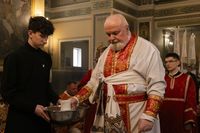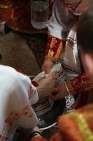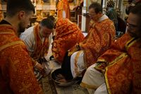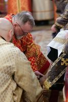 Старший священник відповідає: «Повік не митимеш мені ноги» — і чує відповідь від архиєрея: «Якщо не митиму, то не матимеш частки зі Мною». У відповідь на ці слова священник вказує на свої руки і голову, кажучи: «Господи, не лише ноги мої, а й руки і голову». Далі владика говорить: «Той, що обмитий, потребує лиш умивання ніг, бо весь уже чистий», — і умиває ноги старшому священникові.