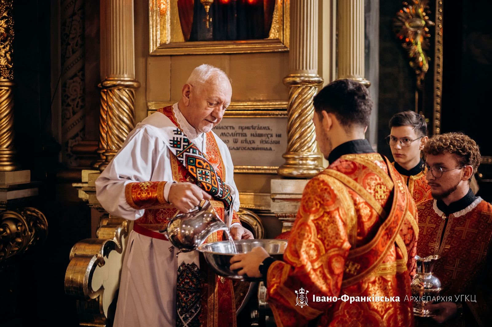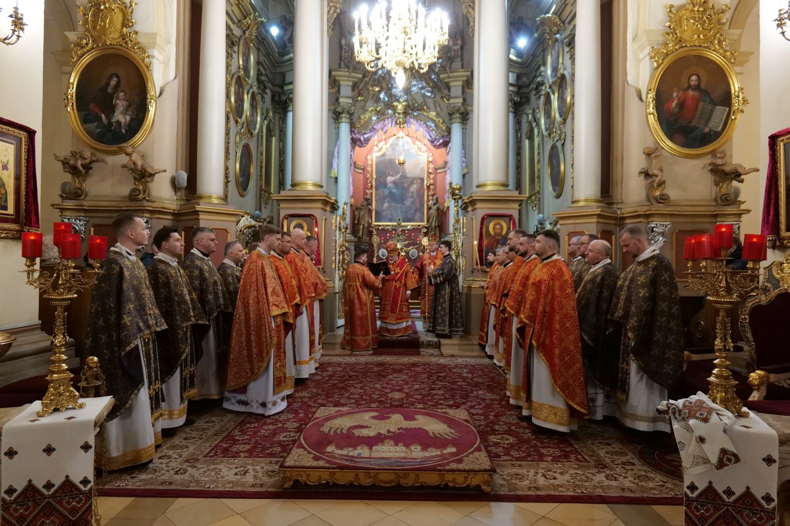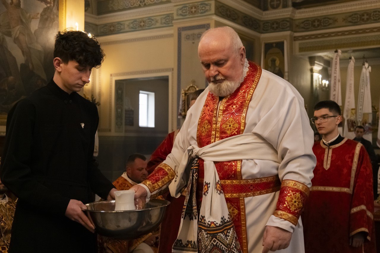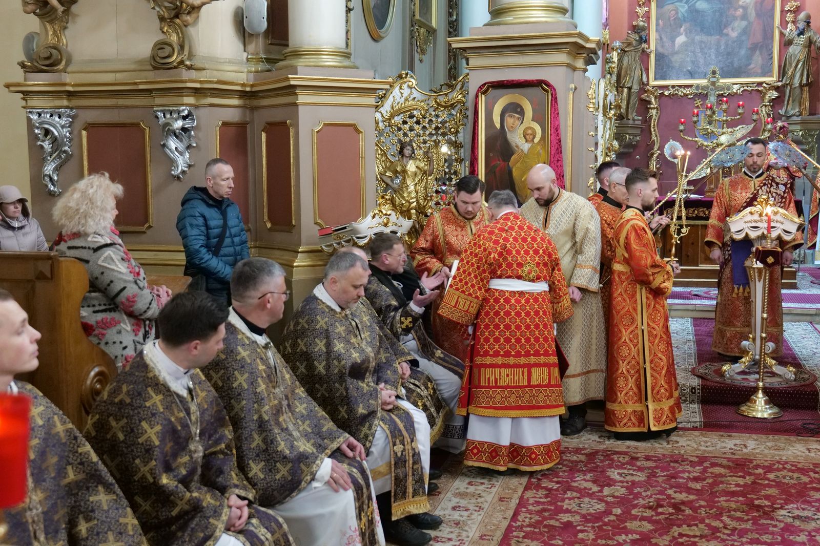 Архиєпископ і митрополит Львівський Ігор Возьняк у Великий четвер очолив Вечірню з Божественною Літургією святого Василія Великого в архикатедральному соборі Святого Юрія і звершив Чин умивання ніг священникам на спомин про те, як Ісус Христос омив ноги своїм учням.