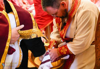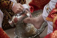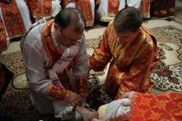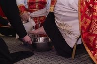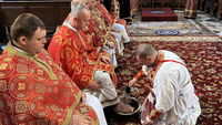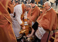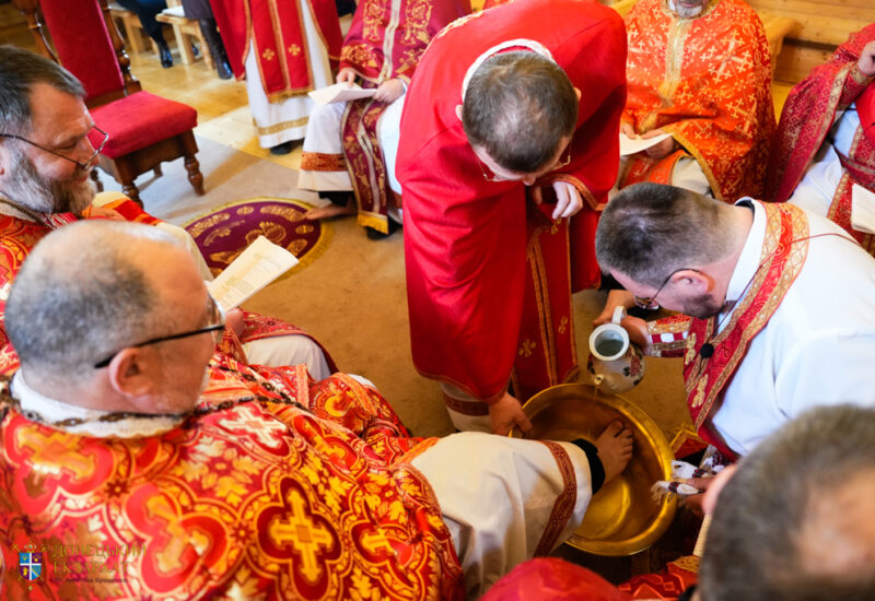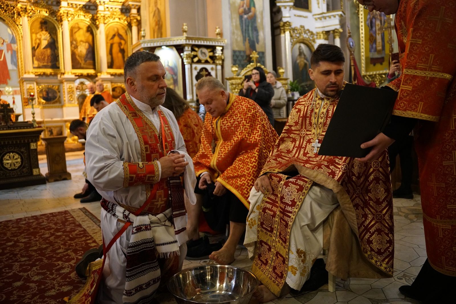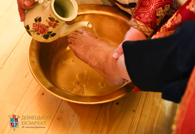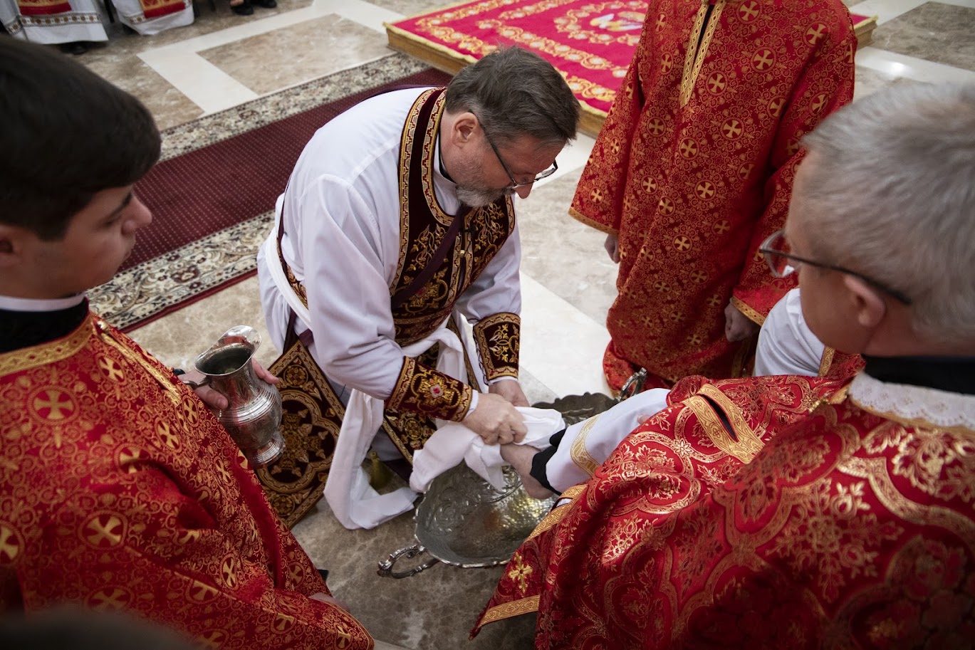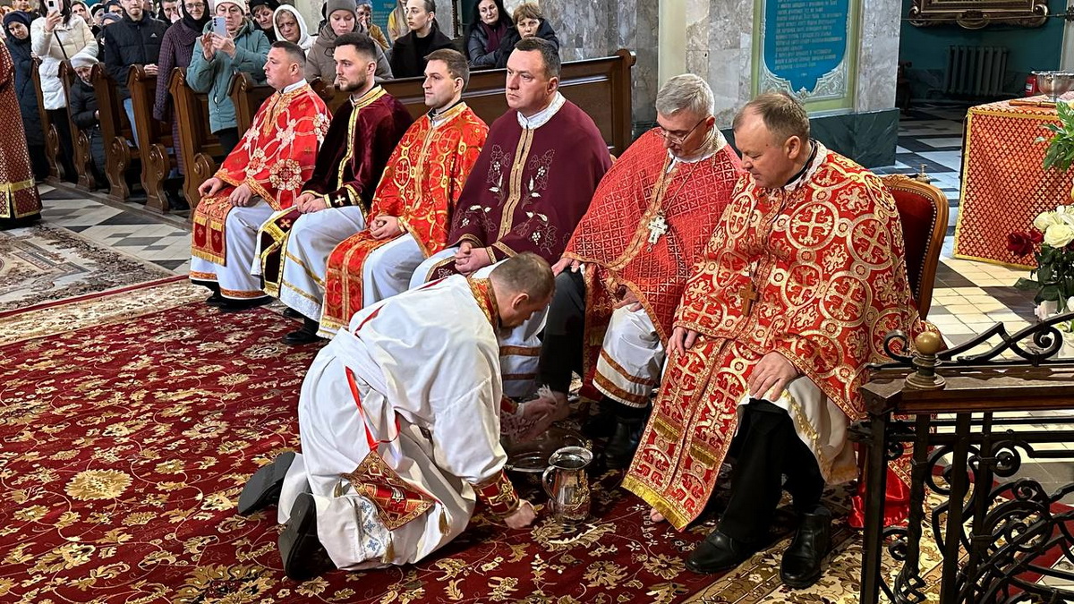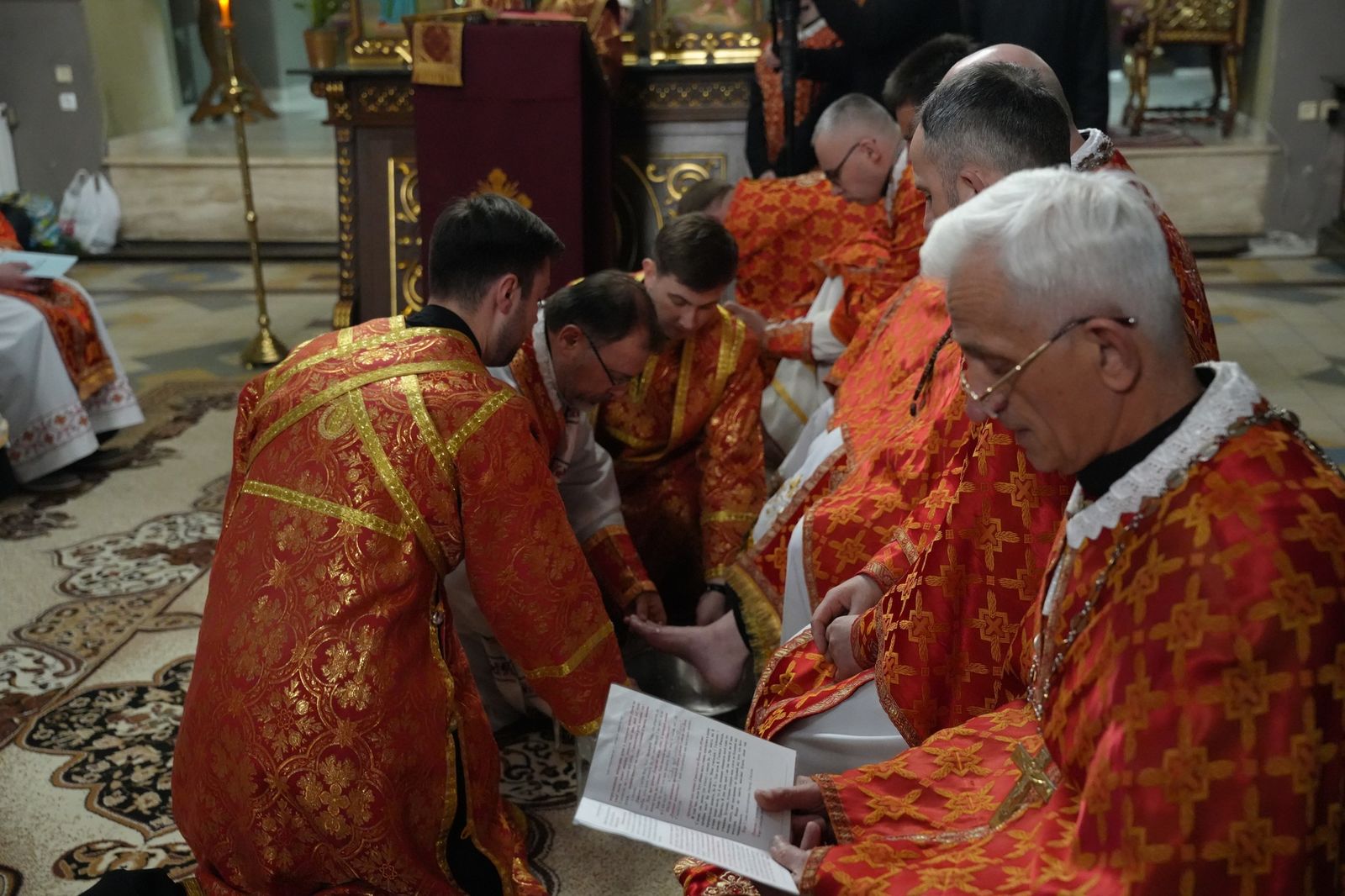 Після Заамвонної молитви архиєрей, наслідуючи приклад Ісуса Христа під час Тайної Вечері, перепоясався рушником, влив освячену воду до умивальниці та обмив ноги дванадцятьом священникам архиєпархії.