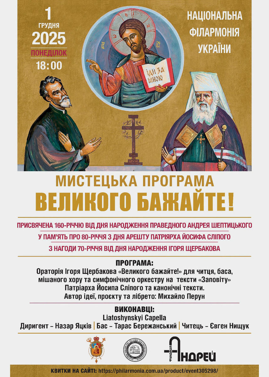 У понеділок, 1 грудня 2025 року, у Національній філармонії України (м. Київ, Володимирський узвіз, 2) відбудеться мистецька програма «Великого бажайте!», присвячена 160-річчю від дня народження праведного митрополита Андрея Шептицького та 80-річчю від дня арешту патріарха Йосифа Сліпого.