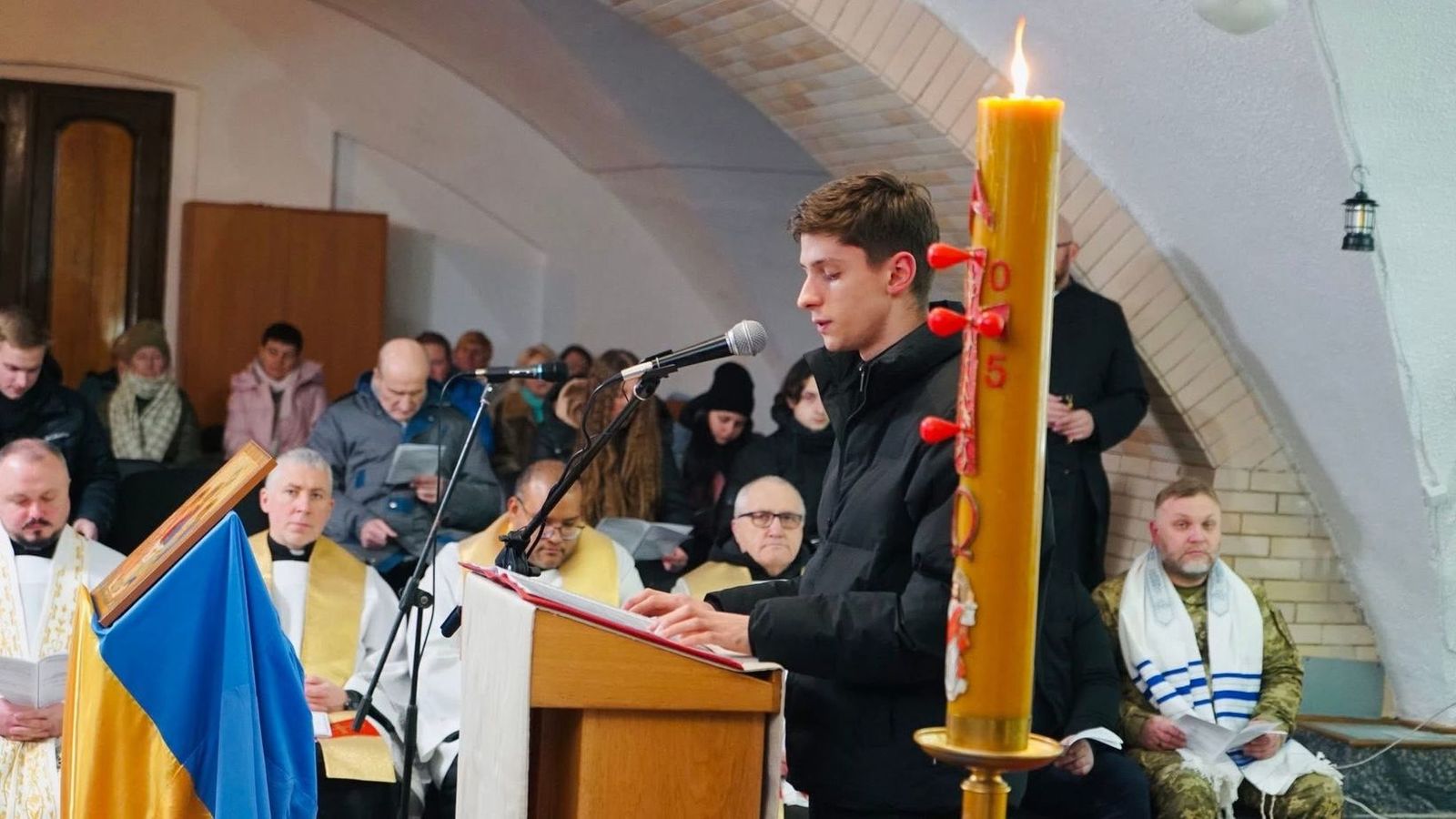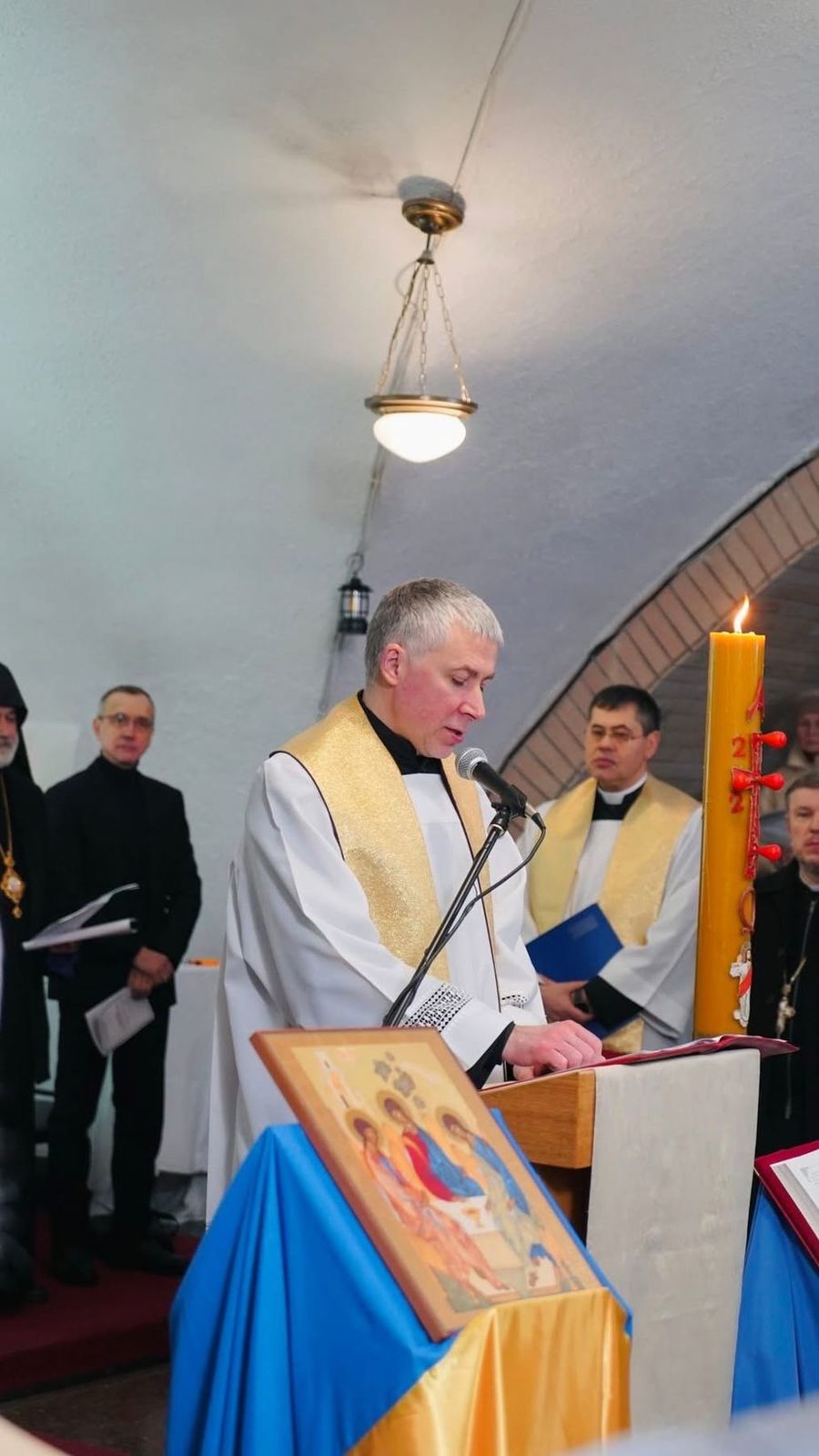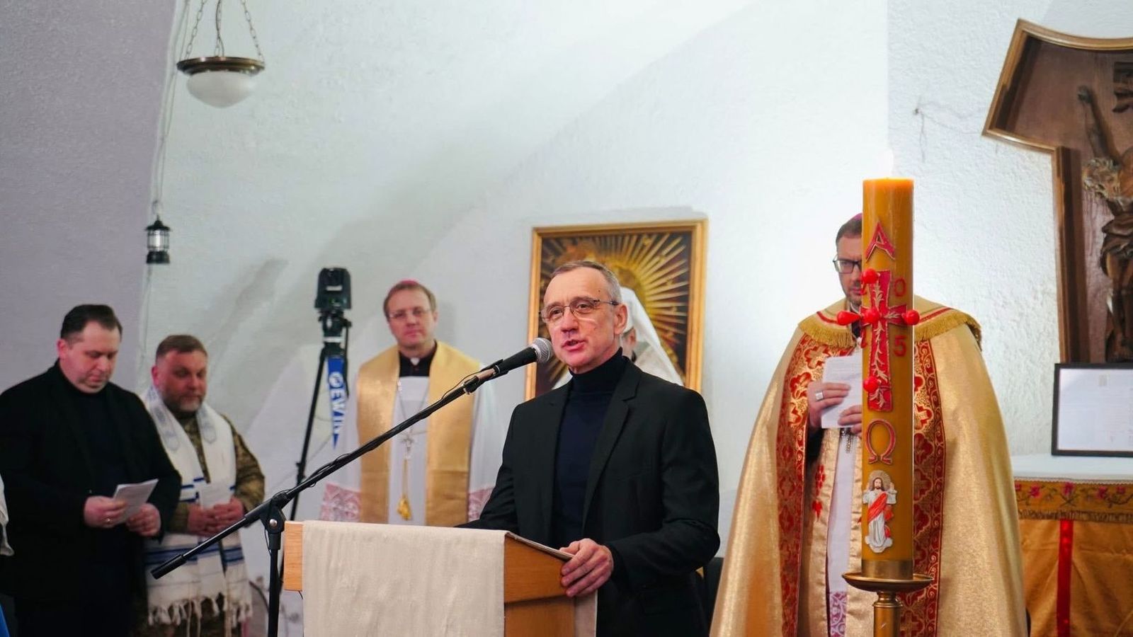Єпископ-помічник Київсько-Житомирської дієцезії РКЦ Олександр Язловецький, звертаючись до присутніх, розповів, що ординарій дієцезії Віталій Кривицький прагнув, аби ця міжконфесійна молитва відбулася саме у храмі святого Миколая ще тоді, коли він не був переданий у користування громаді РКЦ. Єпископ звернув увагу й на умови, в яких проходила молитва: через вибиті вітражі внаслідок нещодавньої російської атаки основне приміщення храму залишається холодним, тож молебень відбувся у підвальному просторі, який вдалося обігріти. Він подякував християнам України за підтримку у прагненні римо-католиків повернути храм у своє користування.