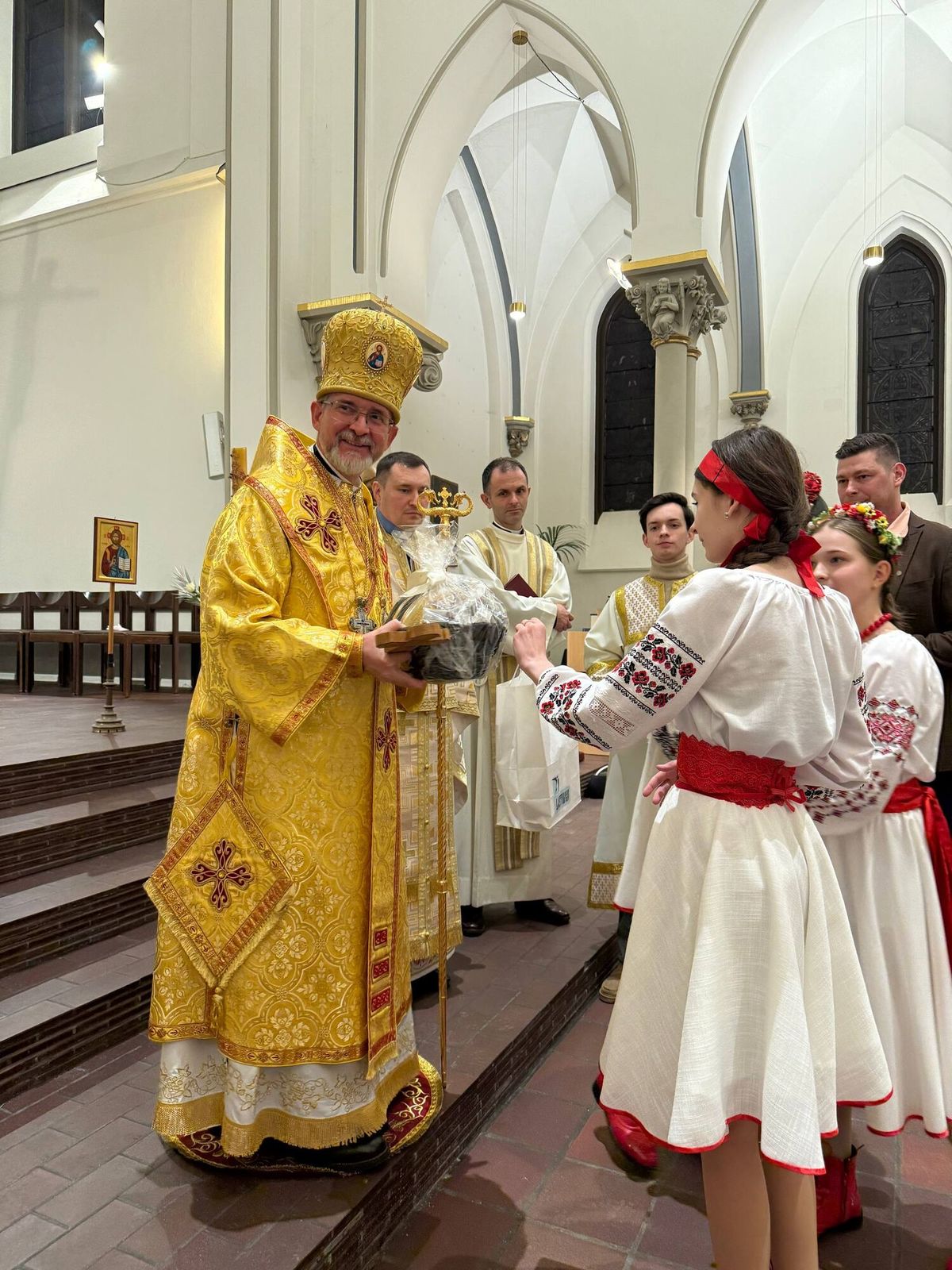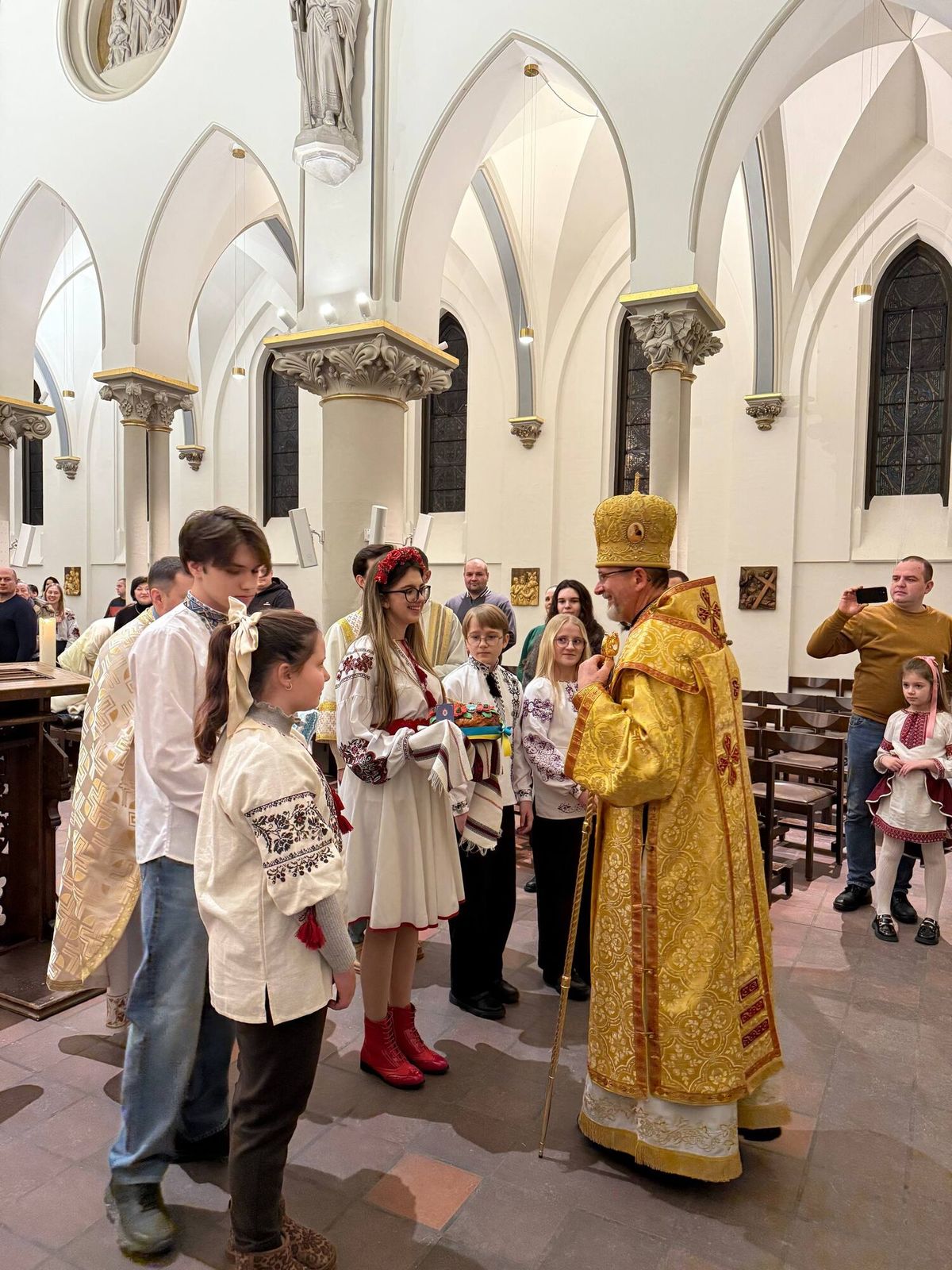 На завершення Літургії громада привітала душпастиря о. Василя Смицнюка з 20-літнім ювілеєм священничих свячень, дякуючи за його віддане служіння українцям у Данії. Святкування продовжилося різдвяною розколядою за участі театру «Вільний птах» та вокального колективу «Співаночки», які створили атмосферу радості й спільного святкування.