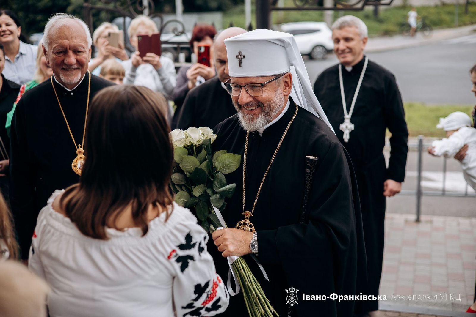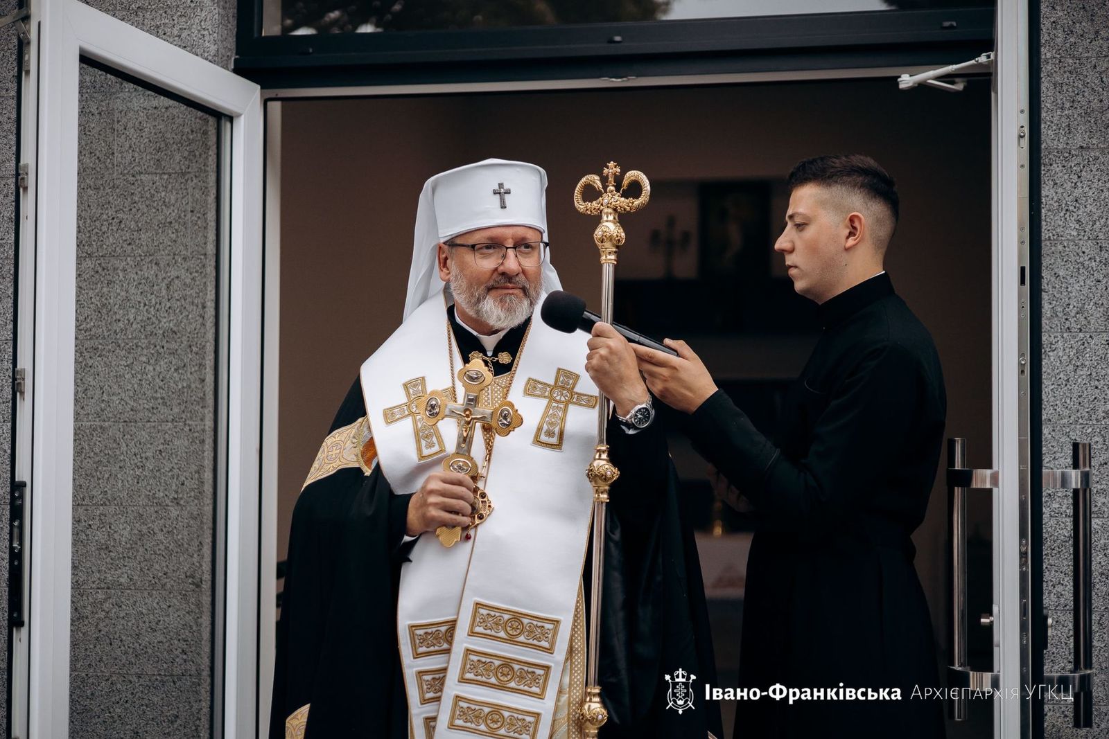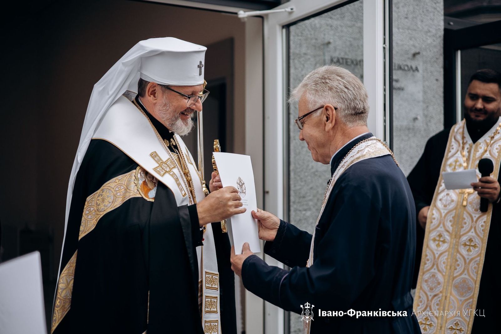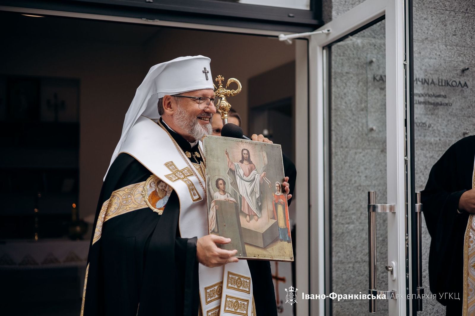 Поблагословивши освяченою водою приміщення школи, Отець і Глава УГКЦ звернувся до присутніх: «Дивні Божі дороги! Після вчорашньої велелюдної прощі до Крилоської гори, сьогодні ми прибули до вас. Ця парафія святого Йосифа Обручника, одна із найстарших в Івано-Франківську, здійснила колосальну роль в історії нашої Церкви. І ось, сьогодні ми тут, щоби освятити нову катехитичну школу, яка носитиме ім’я праведного митрополита Андрея Шептицького».