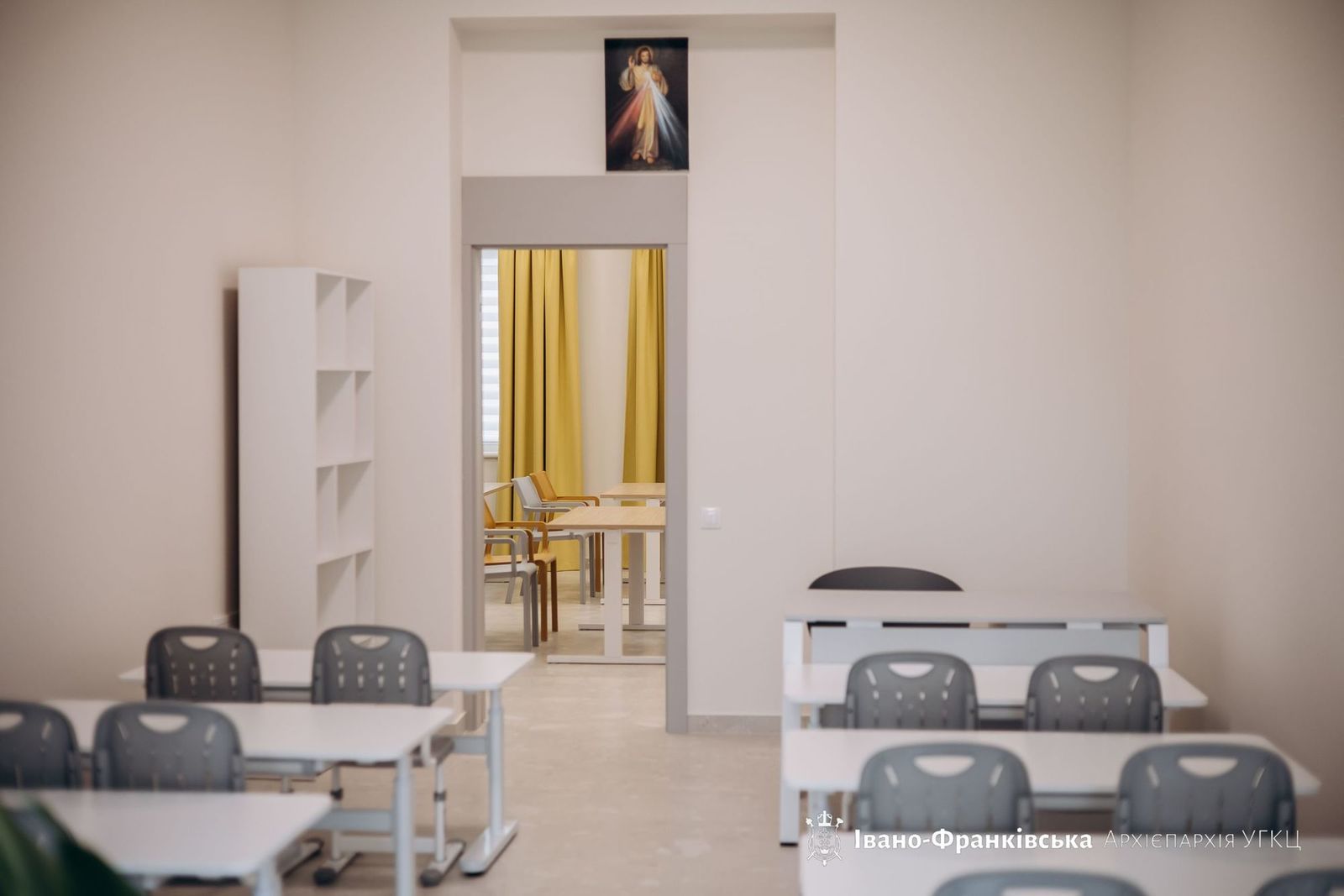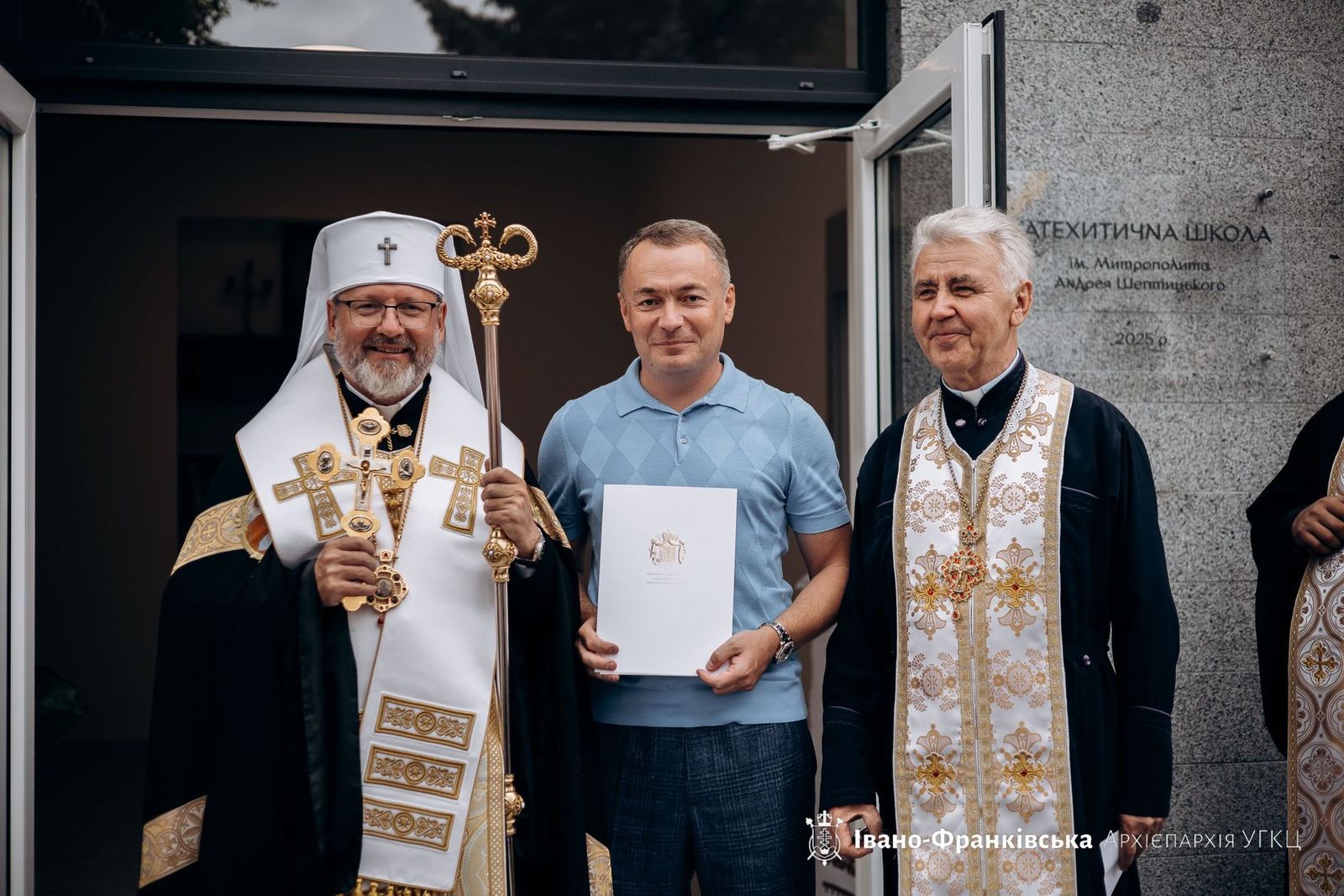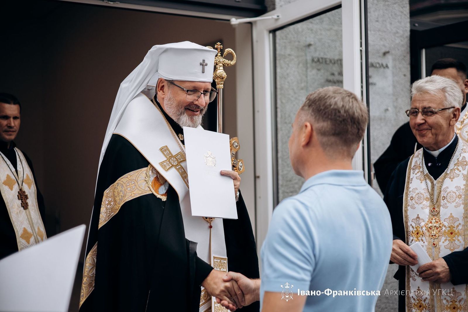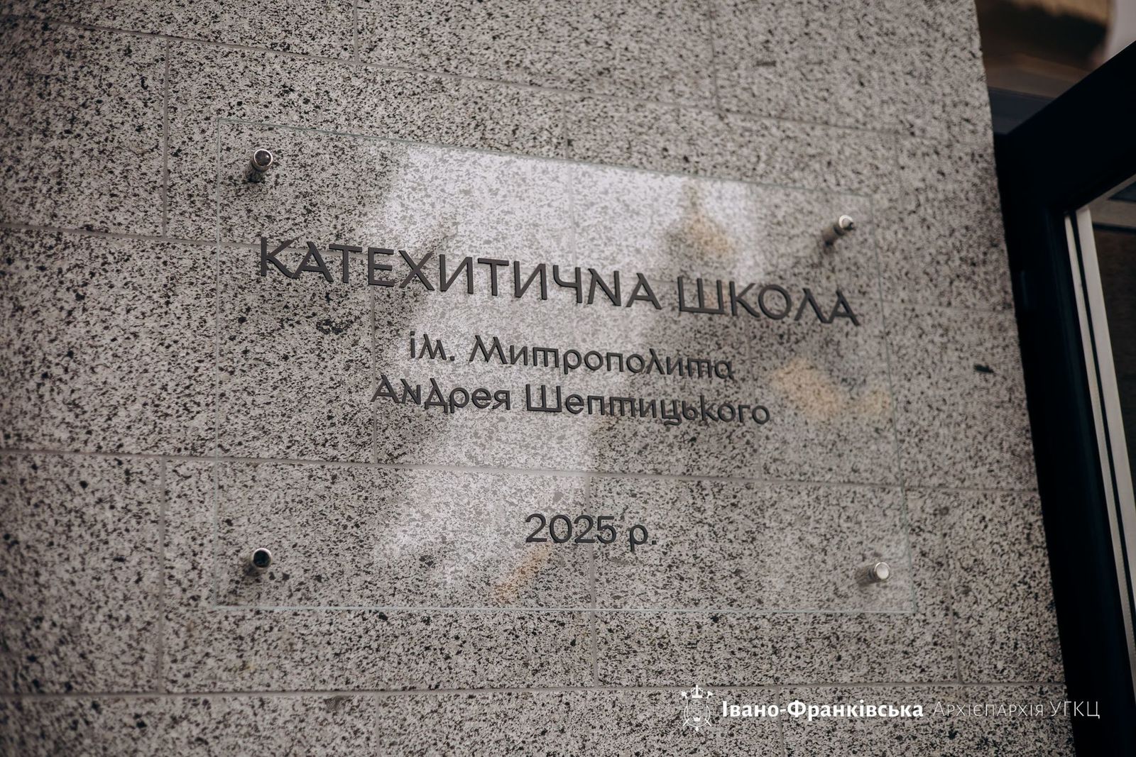 Поблагословивши освяченою водою приміщення школи, Отець і Глава УГКЦ звернувся до присутніх: «Дивні Божі дороги! Після вчорашньої велелюдної прощі до Крилоської гори, сьогодні ми прибули до вас. Ця парафія святого Йосифа Обручника, одна із найстарших в Івано-Франківську, здійснила колосальну роль в історії нашої Церкви. І ось, сьогодні ми тут, щоби освятити нову катехитичну школу, яка носитиме ім’я праведного митрополита Андрея Шептицького».