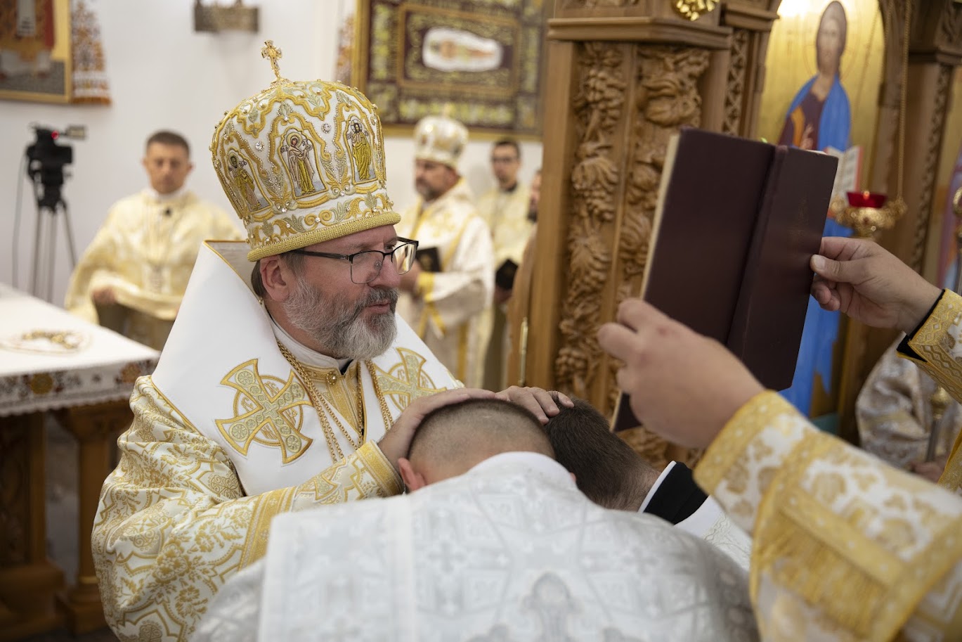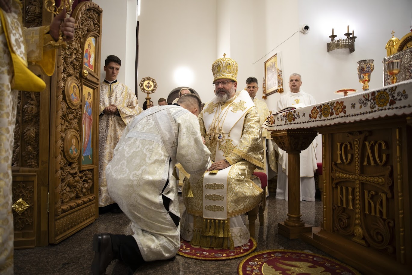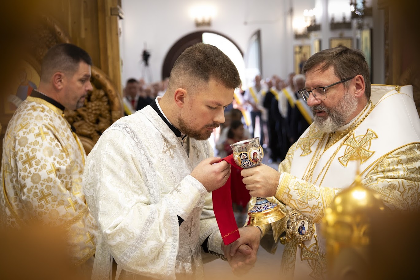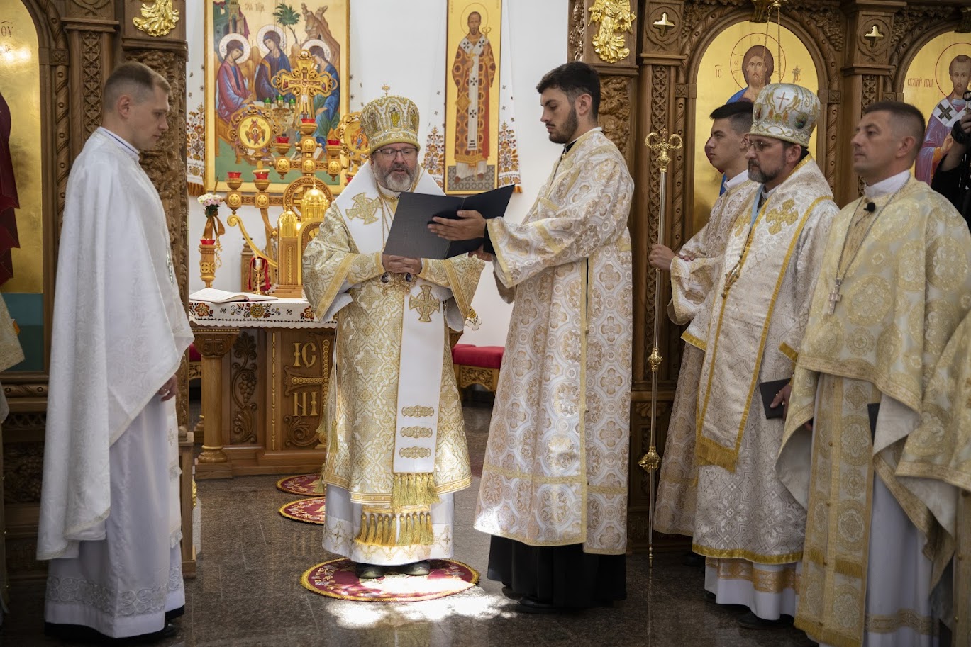 Під час Літургії Блаженніший Святослав уділив священничі свячення дияконам Віталію Олійнику та Мар’яну Довганику, а також дияконські свячення Вадиму Поліщуку, випускникам Київської Трьохсвятительської духовної семінарії.