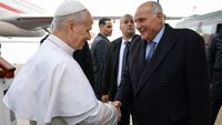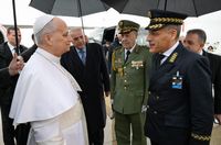 Після понад годинного перельоту, о 10:32 літак з Папою на борту приземлився в аеропорту Аннаби, сучасного алжирського міста, що виросло біля археологічних залишків античного Гіппона. Його під проливним дощем зустріли єпископ Мішель-Ґійо, Ординарій Константини-Гіппону, а також міністри закордонних справ і культури Алжиру, група людей з парасольками в руках і в дощовиках, вишикувані військові та дві дівчини в традиційному вбранні з квітами в руках. У залі аеропорту його чекали інші діти в традиційному вбранні, щоб привітати арабською, англійською та італійською мовами.