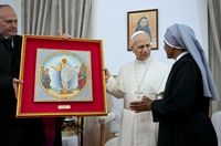 «Дякую вам, дорогі сестри і дорогі брати, за цю зустріч! Молюсь за вас і від щирого серця вам благословляю», — запевнив Лев XIV та передав для присутніх на згадку про зустріч подарунок. Ним стала ікона Воскресіння, яку створив албанський мозаїст та іконописець Йосиф Дробоніку. На ній світла постать Христа в оточенні учнів символізує перехід від перемоги над смертю до проповіді Євангелія всім народам. У нижній частині ікони міститься напис грецькою мовою з Євангелії від Матея: «Ідіть же і навчіть всі народи». Цей образ закликає людей не лише до споглядання божественної слави, а й до конкретних вчинків милосердя, які є видимим свідченням любові до Бога.