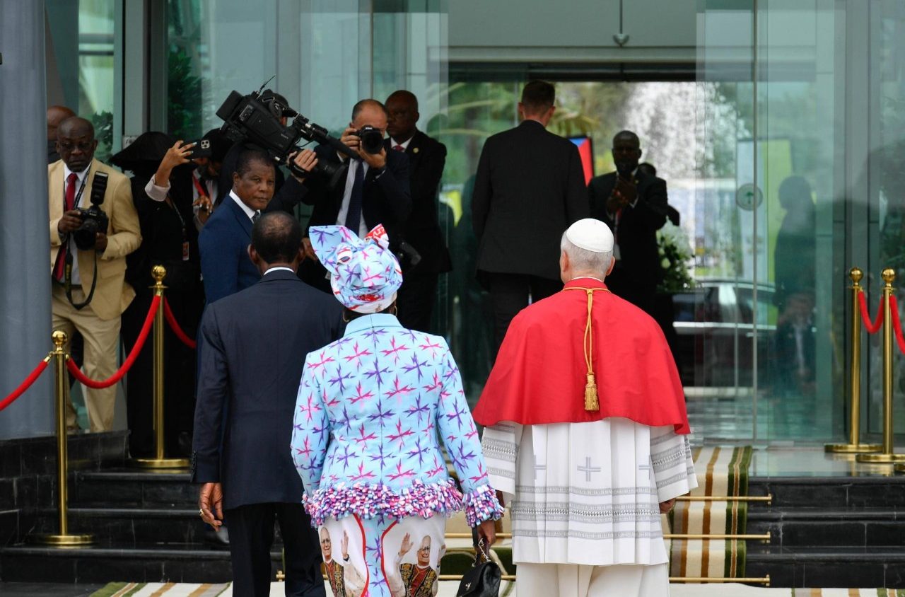 Об 11:31 місцевого часу, (13:31 — київського) в міжнародному аеропорту Малабо приземлився літак італійської авіакомпанії ITA Airways з Папою Левом XIV на борту, який прибув із Луанди, столиці Анголи, перетнувши повітряний простір ДР Конго, Ґабону та Камеруну. На летовищі відбулася церемонія привітання за участі президента Теодоро Обіанґа Нґеми Мбасоґо, яка не передбачала промов. З летовища вони від’їхали до президентського палацу. Там відбудеться візит ввічливості до глави держави та зустріч з представниками влади.