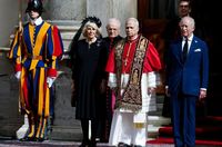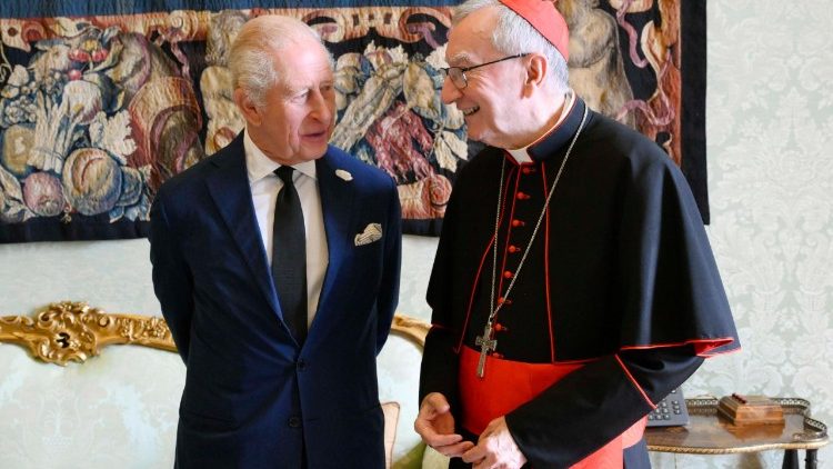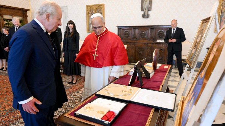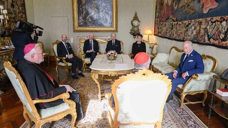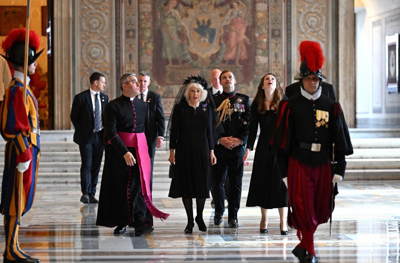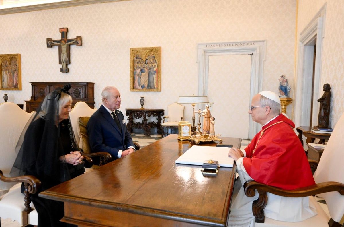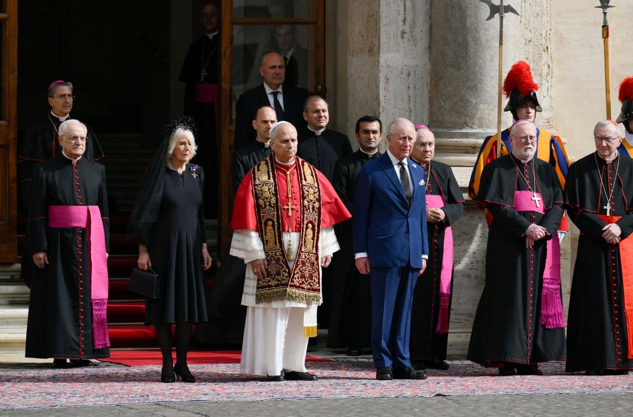 Королівська пара прибула до Ватикану о 10:50. Їх зустріли на внутрішньому подвірʼї Святого Дамазія, згідно з протоколом державних візитів. Після того, як оркестр Жандармерії виконав гімн «God Save the King», у супроводі почесної варти швейцарських гвардійців король Чарльз III і королева Камілла увійшли до Апостольського палацу. Далі відбулася приватна аудієнція Папи з монархами, а потім кілька паралельних зустрічей: королева Камілла відвідала Паолінську каплицю, а король Чарльз провів переговори в Державному Секретаріаті з кардиналом П’єтро Пароліном.