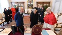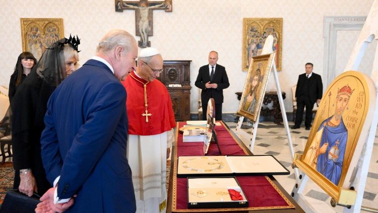 Перейшовши до Королівського залу Апостольського палацу, Папа і король Чарльз взяли участь у зустрічі, присвяченій екологічній сталості, яку відкрила сестра Алессандра Смеріллі, Секретар Дикастерії служіння цілісному людському розвитку. Символічним моментом став обмін між Папою і монархом двома ідентичними екземплярами Cymbidium, рослини з родини орхідей. Ця рослина відома своєю силою та витривалістю, а також здатністю пристосовуватися та квітнути навіть у складних умовах. Обмін став вираженням спільної відданості справі захисту навколишнього середовища та піклування про Боже творіння.