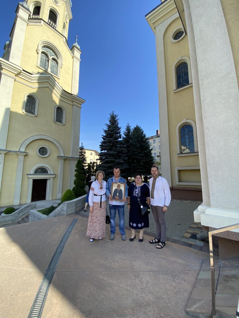 Працівники львівської квартири-музею Василія Величковського на подвір’ї храму Успення Пресвятої Богородиці в Тернополі. На цьому місці розташовувався монастир, де служив о. Василій. Фото: Тарас Гуль