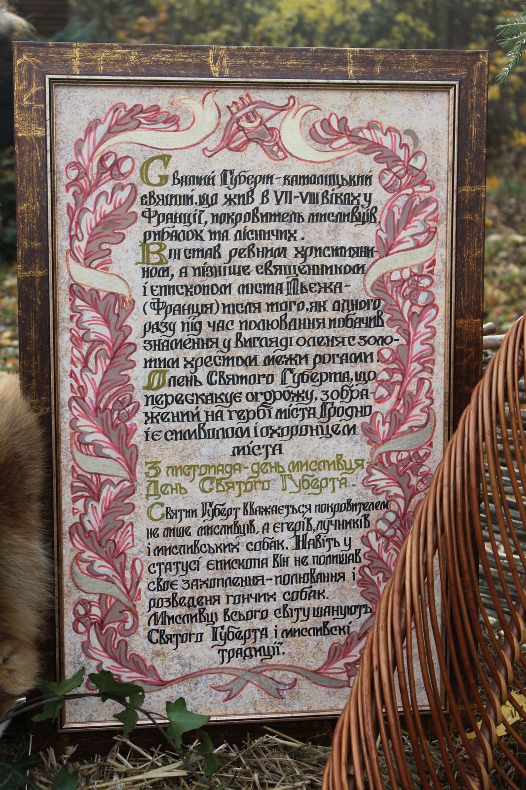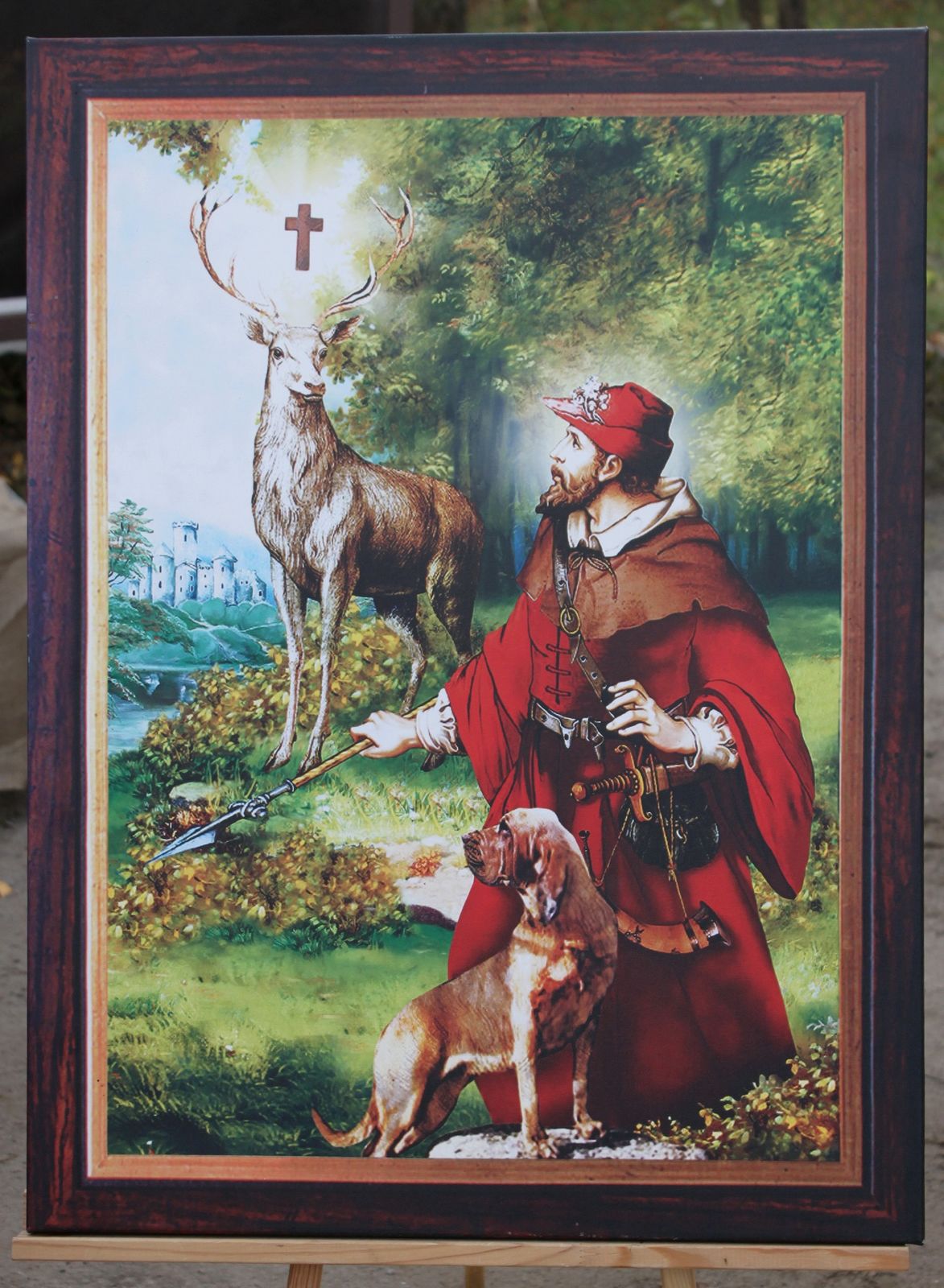 Святий Губерт — єпископ Льєжа, вважається покровителем мисливців, єгерів, лучників, лісників та мисливських собак. Народився в 650-х у Тулузі (Франція) в родині Бертрана, герцога Аквітанського. За переказами, замолоду Губерт був пристрасним мисливцем і шанувальником світських розваг; після смерті дружини при пологах повністю присвятив себе мисливству. Вранці Страсної П’ятниці Губерт вирушив на полювання і побачив у лісі надзвичайно красивого оленя. Він погнався за ним, та як тільки націлив на звіра зброю, той обернувся і між його рогами засвітився хрест. У той самий момент мисливець почув голос, що закликав його до покаяння; за легендою, пролунали слова: «Чи не час уже перестати звірину убивати, чи не час тобі уже Бога шукати?!». Вражений мисливець відмовився від усіх своїх титулів і спадщини на користь молодшого брата Одо, що став опікуном його сина, а сам ступив на дорогу священства. Пізніше Губерт був обраний єпископом Льєжа і здобув велику шану і любов серед вірних. Він помер у 727 році, а в 1744 римський папа Бенедикт XIV канонізував його.