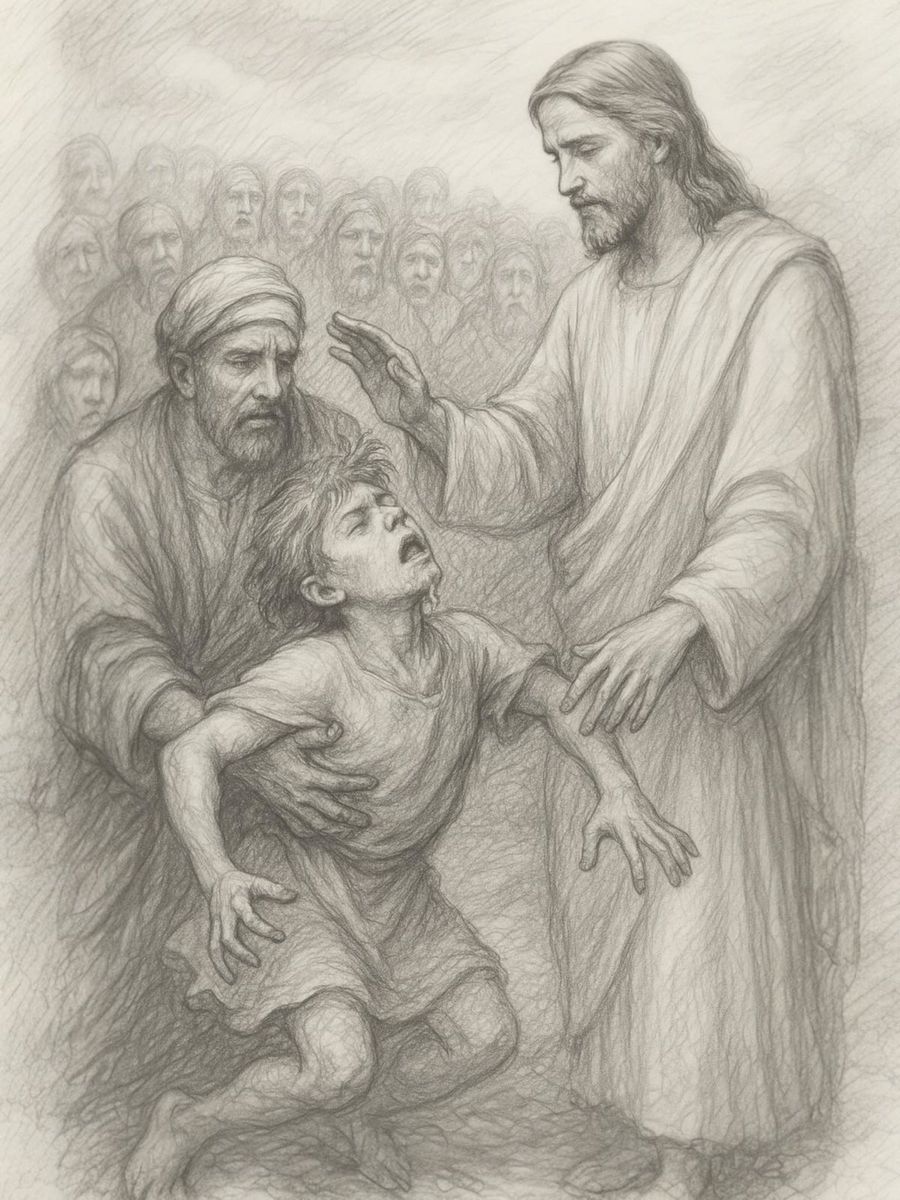 Євангельська розповідь розпочинається з того, що батько привів до Ісуса свого сина, який названий біснуватим епілептиком. Він кидався у вогонь чи воду. Бачимо дві крайності, які хитають людиною.