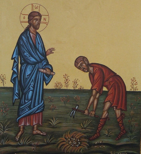 І). Притча про таланти починається: «І Царство Небесне буде […] мов той чоловік, що, пускаючись у дорогу, прикликав своїх слуг і передав їм своє майно» (Мт. 25, 14). Євангеліє описує образ Бога, котрий роздає таланти. Отримавши таланти, людям потрібно навчитися мудро користуватися цим дарами і примножувати їх. Господар роздає таланти слугам, враховуючи їх здібності і від’їжджає. Слуги мають приймати власні рішення, куди вкладати ці багатства. Один слуга отримав п’ять талантів і заробив ще інших п’ять талантів. Другий слуга отримав два таланти і доробився ще двох талантів. Третій слуга отримав один талант, перелякався і закопав його. Він каже господареві: «Пане, знав я тебе, що ти жорстокий чоловік. (…). Тому зо страху я пішов і закопав талант твій у землю. Ось він — маєш твоє» (Мт. 25, 24–25). Господар вирішує долю лінивого слуги і приказує забрати в нього той один талант та віддати тому, хто має десять. Нікчемний слуга боявся працювати над собою, часто відпочивав, беріг своє здоров`я і тому був вкинутий туди, де є «плач і скрегіт зубів» (Мт. 25, 30).