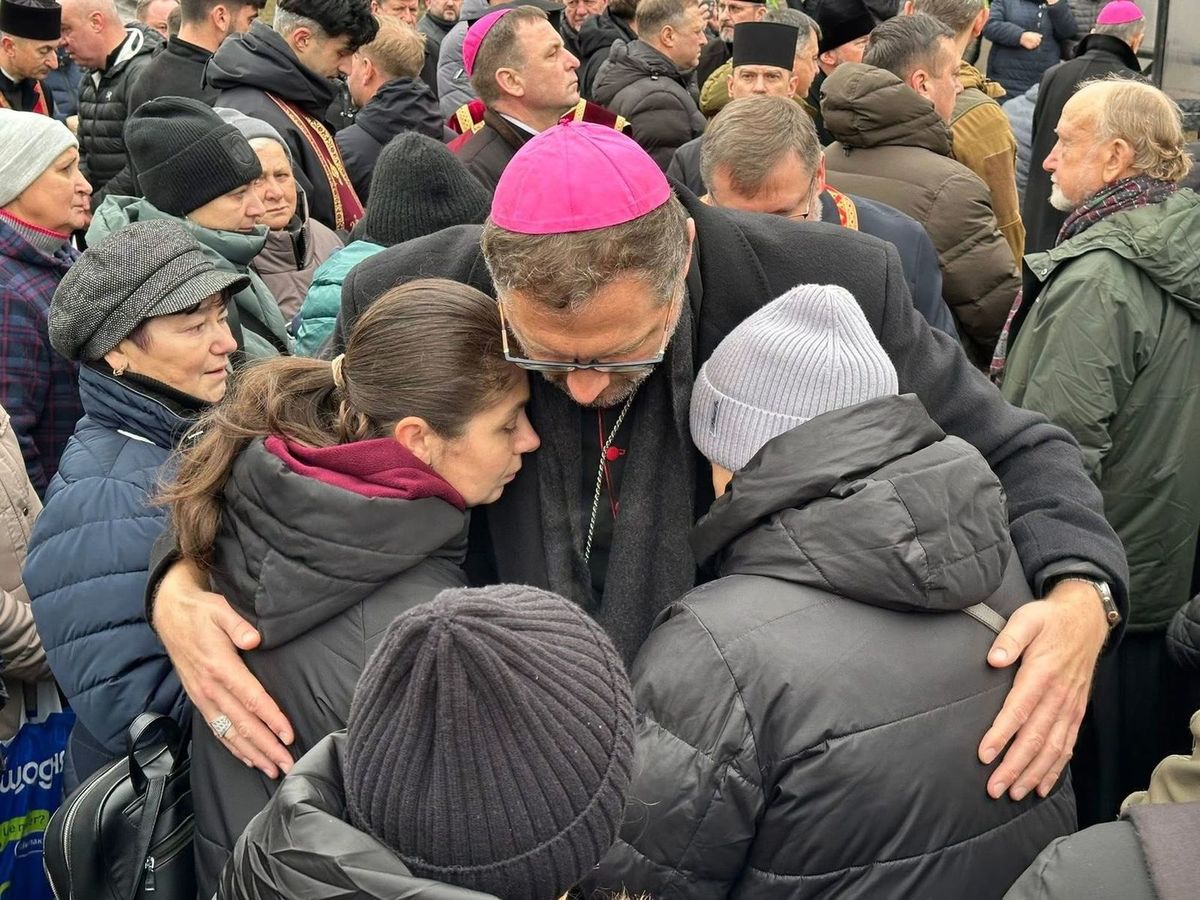 Ініціатива виникла вже вчора [ред. — 25 листопада], оскільки кілька єпископів висловили таке бажання. Митрополит Тернопільської греко-католицької архиєпархії владика Теодор Мартинюк вже вчора почав організовувати цей візит, також тому, що йдеться про місця, які є частково недоступними через роботи, які ще ведуться, хоча рятувальні роботи вже завершено. Отже, ця ініціатива була підготовлена вчора ввечері в погодженні з міською та обласною адміністрацією. І була організована також зустріч з родичами загиблих. Хоча потім прийшло багато інших людей, бо щодня туди приходять люди, приносять лампадки, моляться, приносять символічні подарунки загиблим дітям. Тому ми зустрілися як з родичами жертв — батьками, матерями, бабусями, — так і з тими людьми, які опинилися там спонтанно. Їх було небагато, але це був спосіб поплакати разом з ними.