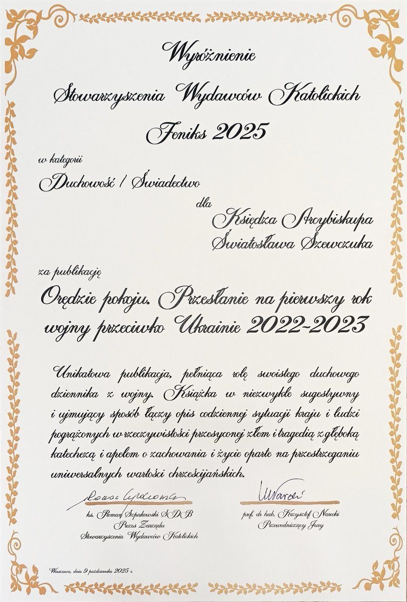 Польська версія книжки звернень Отця і Глави УГКЦ Блаженнішого Святослава «Україна стоїть! Україна бореться! Україна молиться!», що вийшла у люблінському видавництві «Gaudium» під назвою «Послання Миру», отримала престижну нагороду «Фенікс 2025» Форуму католицьких видавців Польщі в категорії «Духовність — свідчення».