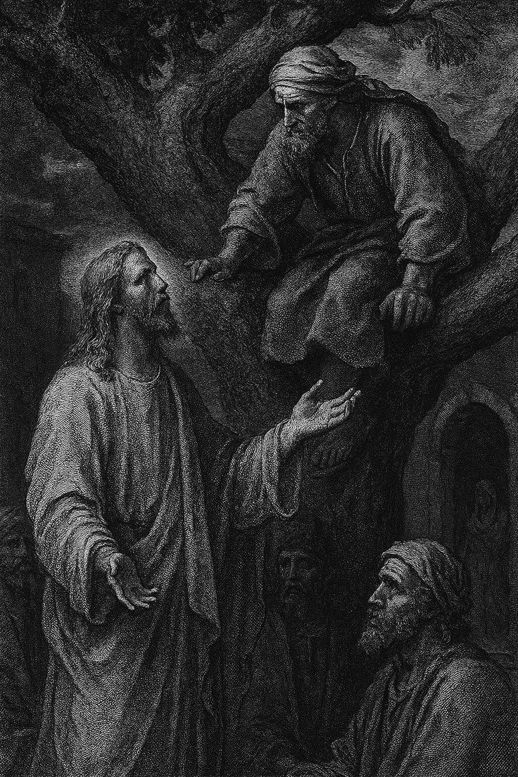 Ісус прямує до Єрусалиму (Лк. 9, 51–19, 40), бо час спасіння вже наблизився. Те, що було «неможливе в людей, є можливе в Бога» (Лк. 18, 27), тому зустріч із Закхеєм є здійсненням неможливого. Закхей був не лише митарем (таким яким був Леві — згодом апостол Матей), але «головою над митарями» і був дуже «багатий». Коли Ісус проходив поблизу його дому, Закхей за всяку ціну «бажав бачити Ісуса» (Лк.19,3) і з цією метою виліз на дерево (євангелист говорить про «сикомор»), «щоб подивитися на нього» (Лк. 19, 4). У такий спосіб Ісус побачив Закхея і звернувся до нього зі словами, над якими можна багато роздумувати: «Закхею, притьмом злізай, бо я сьогодні маю бути в твоєму домі» (Лк.19,5). Христос не лише дав зрозуміти, що побачив його (начальника митарів, тобто людину певної посади) на дереві, але, що більше, засвідчив перед іншими, що хоче «затриматися у його домі» (Лк. 19, 5). Це викликало радість у Закхея, і одночасно ремствування серед тих, яким таке спілкування Вчителя з Назарету із «митарями та грішниками», очевидно, не подобалось.