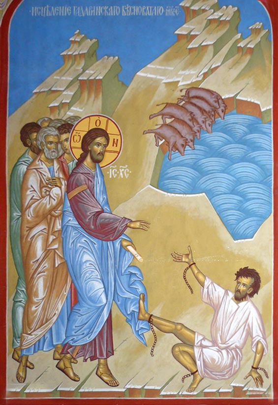 У сьогоднішній Євангельській благовісті ми чуємо про подію екзорцизму — вигнання злих духів, яке чинить Ісус Христос. Це — один з багатьох екзорцизмів згаданих у Євангеліях. Ісус звільняє одержимих людей, щоб показати свою владу над нечистими духами. Вони знають, хто такий Ісус Христос, ще здалека визнають Його Сином Божим: «Що мені й тобі, Ісусе, сину Бога Всевишнього? Благаю тебе, не муч мене!» (Лк. 8,28). Однак випадок, про який чуємо сьогодні, є особливий тим, що відбувається він у Герасин краю, що навпроти Галилеї. Це територія по той бік Йордану. Це одне з міст Десятимістя, або по грецьки Декаполісу, яке населяли здебільшого погани. Однак Христос іде туди, щоб і цей народ, який як писав пророк Ісая, що сидів у темряві і тіні смерті, побачив світло велике. (пор. Іс. 9,1).