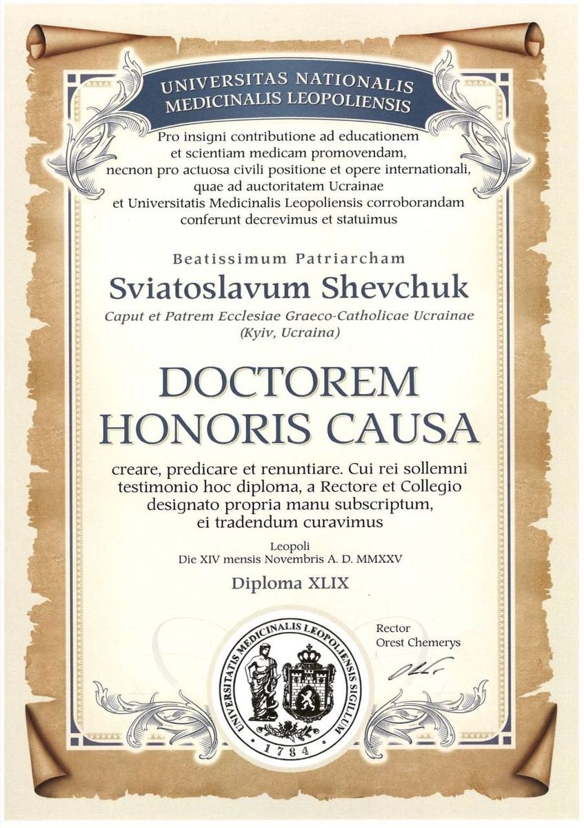 «За видатний внесок в освіту та розвиток медичної науки, а також за активну громадянську позицію та міжнародну діяльність, які підносять авторитет України і підтверджують авторитет Львівського медичного університету, ми постановили і ухвалили надати Блаженнішому Патріарху Святославу Шевчуку, Главі й Отцю Української Греко-Католицької Церкви (Київ, Україна) звання Doctor Honoris Causa, створювати, проповідувати і проголошувати. На підтвердження цього урочистого акту цей диплом, підписаний власноруч Ректором і призначеним Колегією, ми подбали урочисто передати йому», — мовиться в тексті диплома.
