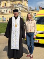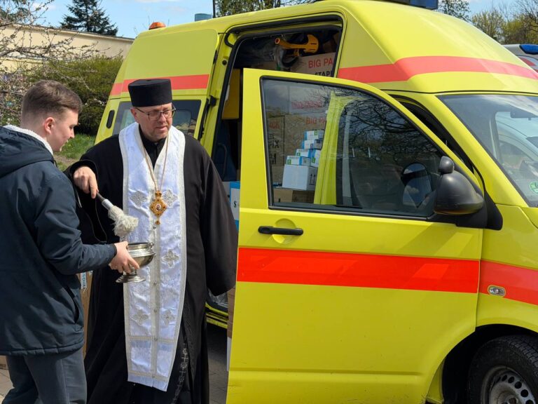 Владика Володимир Груца, єпископ-помічник Львівської архиєпархії УГКЦ, освятив три автомобілі швидкої допомоги, які вкотре передали до Миколаєва з німецького Ганновера стараннями родини о. Романа та Марії Максимців.