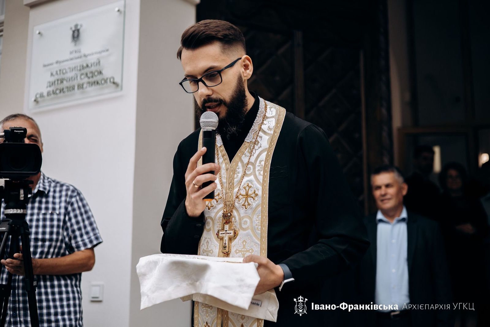 Він подякував Господу Богу, а також місцевій владі за мудре рішення передачі будівлі колишнього Господарського суду (який тут знаходився після відновлення незалежності України) Івано-Франківському архієпархіальному управлінню УГКЦ у 2020 році. Слова подяки лунали також для жертводавців та реставраторів будівлі, й всім, хто буде працювати у Католицькому садочку.