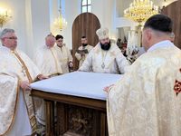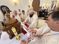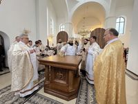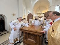 Богослужіння розпочалося посвяченням престолу. Відтак відбувся процесійний хід з мощами, які було покладено на престіл. Стіни храму були помазані єлеєм і окроплені свяченою водою. Після читання Євангелія єпископ виголосив проповідь.