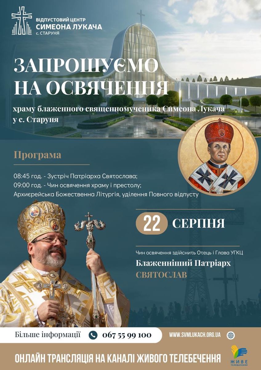 У пʼятницю, 22 серпня, коли наша Церква вшановує пам’ять блаженного священномученика Симеона Лукача, у селі Старуня Івано-Франківської області відбудеться урочисте посвячення нового храму. Святиня постане на честь блаженного священномученика Симеона Лукача. Це знакова подія для всієї Української Греко-Католицької Церкви та великої паломницької спільноти.