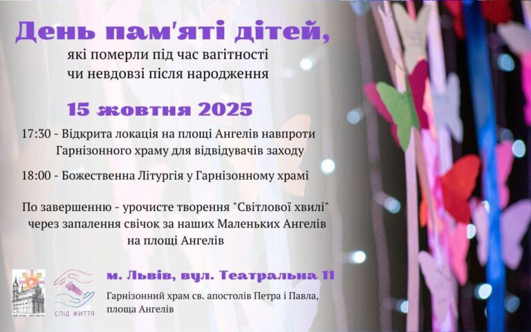 15 жовтня у Львові молитовно вшанують пам’ять дітей, що померли в утробі або невдовзі після народження. Перинатальний хоспіс «Слід Життя» запрошує львів’ян долучитися до всесвітньої меморіальної акції вже восьмий раз.