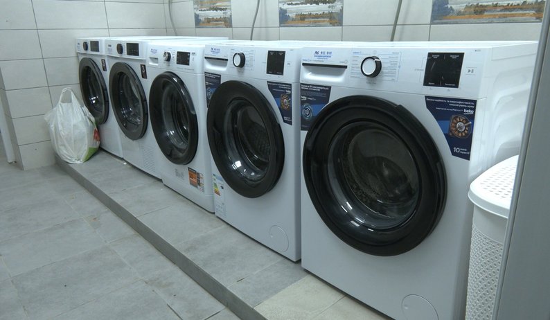 Жінка розповідає, що пере тут речі два роки — від початку роботи пральні.