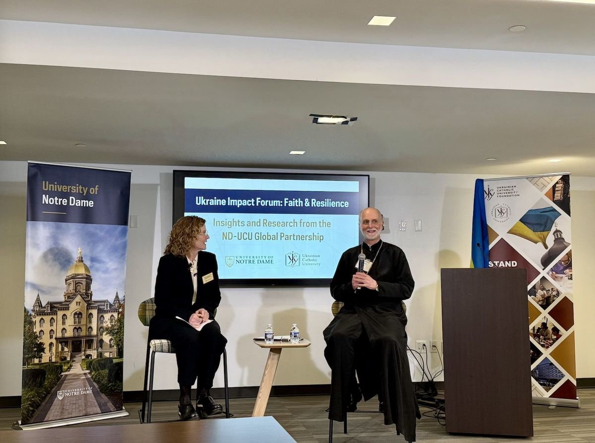 Архиєпископ Борис Ґудзяк взяв участь у розмові біля каміна, присвяченій партнерству між Університетом Нотр-Дам та Українським католицьким університетом, а також ролі академічних інституцій в умовах війни Росії проти України. Модераторкою була Мері Галлагер, декан і професорка глобальних студій Школи глобальних справ Кіо Університету Нотр-Дам.