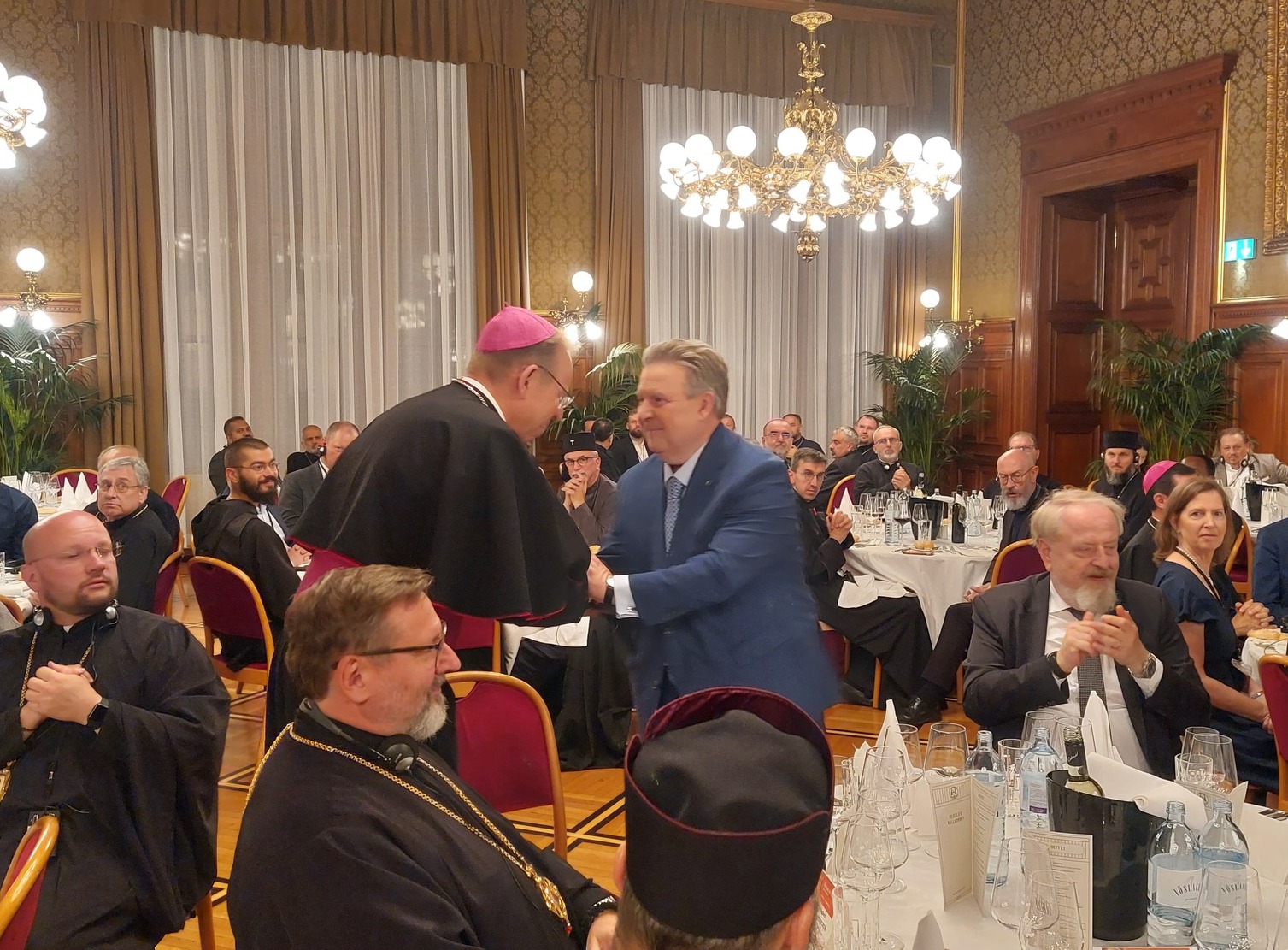 Під час офіційної вечері з нагоди відкриття, організованої мером Відня д-ром Міхаелем Людвігом, архиєпископ Ґінтарас Ґрушас, Президент CCEE, висловив теплі привітання та щиру подяку всім присутнім, особливо меру Відня за його гостинність та щедрий прийом на відкритті Єпископської асамблеї. Архиєпископ Ґрушас наголосив на цінності сопричастя та братерства між Церквами та нагадав, що тема асамблеї «Єдність у різноманітності» є викликом і даром для побудови об’єднаної Європи, заснованої на християнських цінностях миру, справедливості та солідарності.