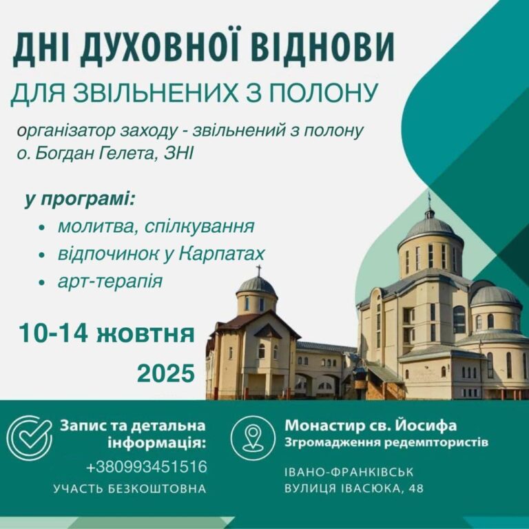 З 10 по 14 жовтня в монастирі святого Йосифа в Івано-Франківську відбудуться дні духовної віднови для звільнених з полону. Захід організовують отці-редемптористи, а провідником стане священник, який сам пережив російський полон, — о. Богдан Гелета.