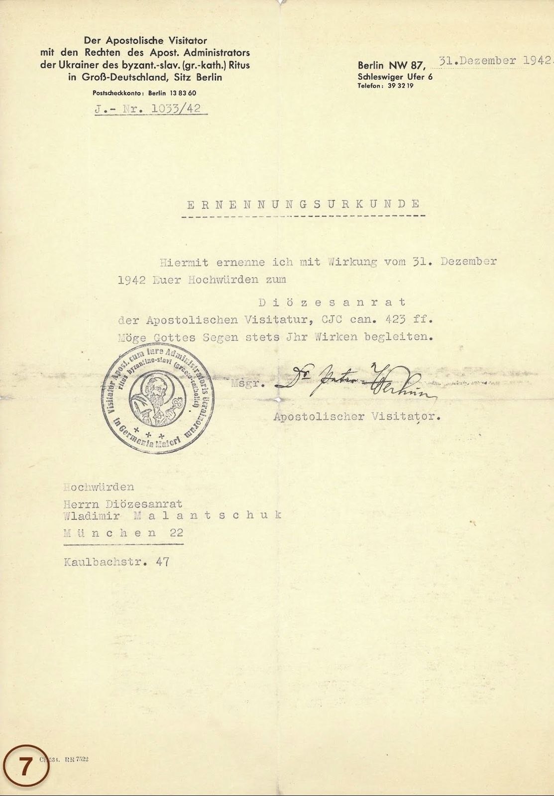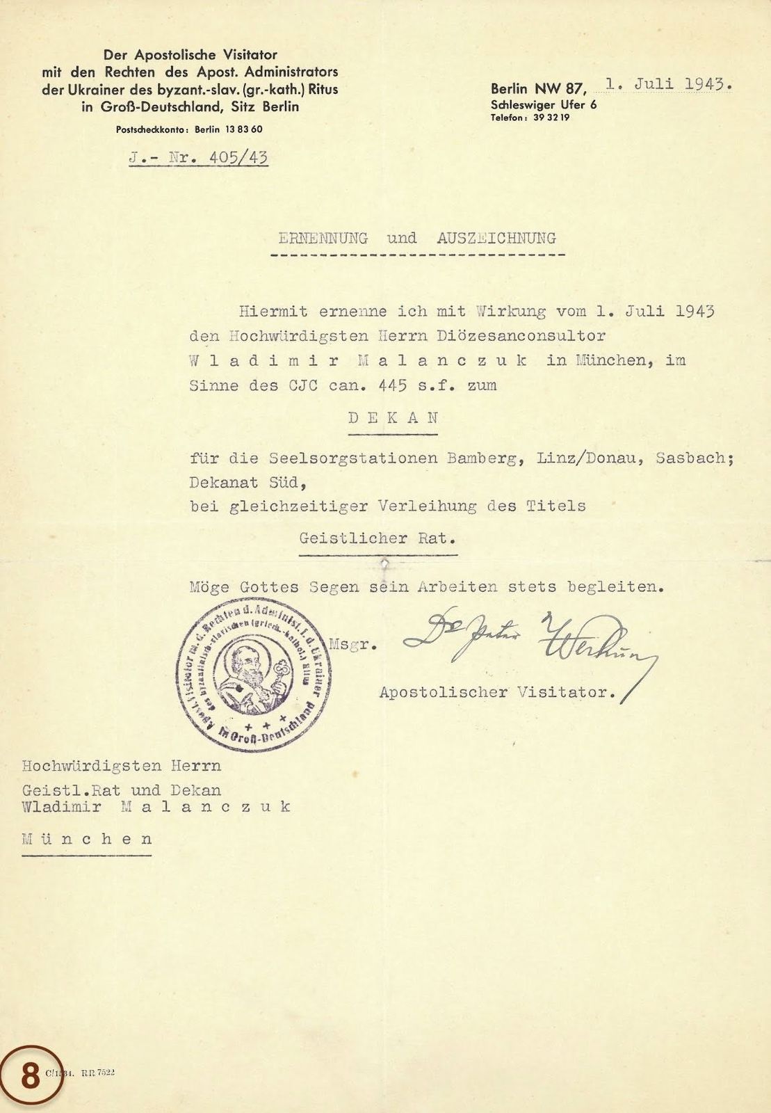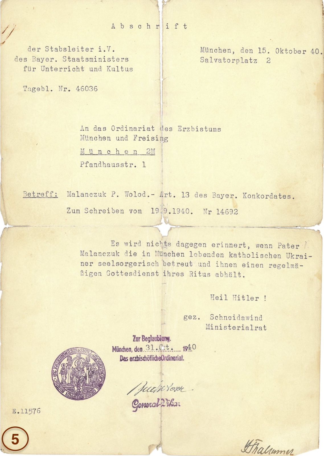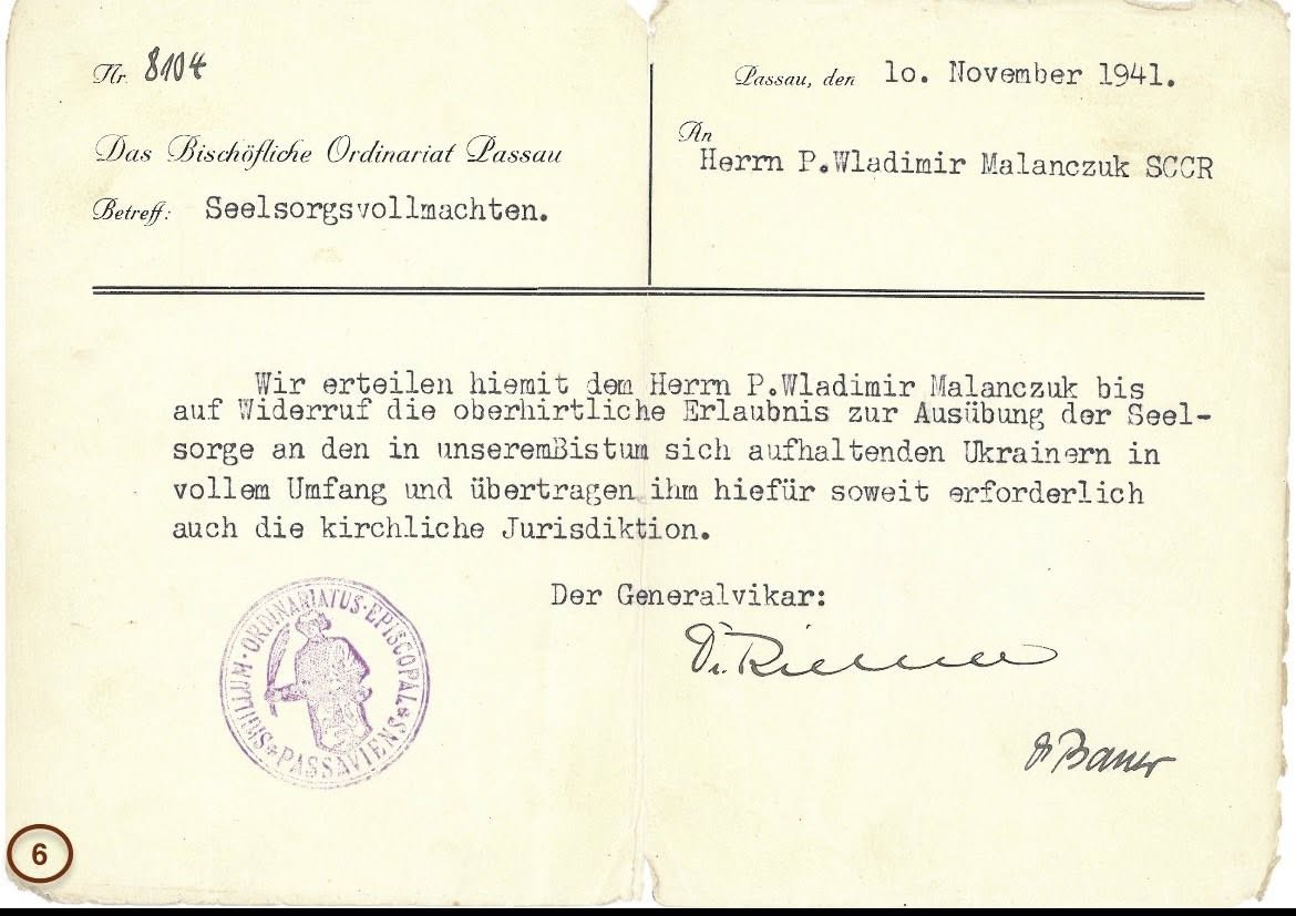 На той час у місті Мюнхені перебували також інші священники: василіянин о. Г. Яремчук та білорус о. Москалик. Українська громада домагалася надання їм юрисдикції для душпастирства. 15 жовтня 1940 року о. Маланчук отримав дозвіл Міністерства культу на душпастирювання та постійну юрисдикцію від Мюнхенського ординаріату. Відтак 7 листопада 1940 року єпископ Шаєр офіційно призначив о. Маланчука душпастирем для українців. Це призначення спричинило певні непорозуміння та поділ серед українців, які вдалося врегулювати завдяки втручанню о. Петра Вергуна.