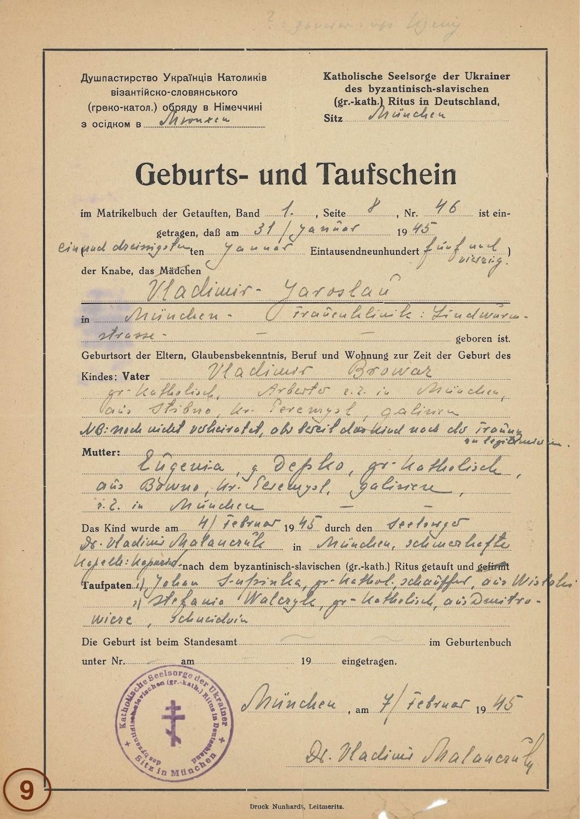 23 листопада 1939 року о. Володимир Маланчук прибув до монастиря німецьких редемптористів у Гарсі, очікуючи на документи для виїзду до Італії. У цей час єпископ Мюнхена д-р Фр. Шаєр запропонував йому опіку над українськими робітниками, які проживали в Мюнхені та окрузі. 9 січня 1940 року священник отримав тимчасову юрисдикцію на душпастирське служіння. 27 серпня 1940 року на прохання єпископа Шаєра німецькі редемптористи в Мюнхені дозволили проводити богослужіння для українців у своєму храмі.